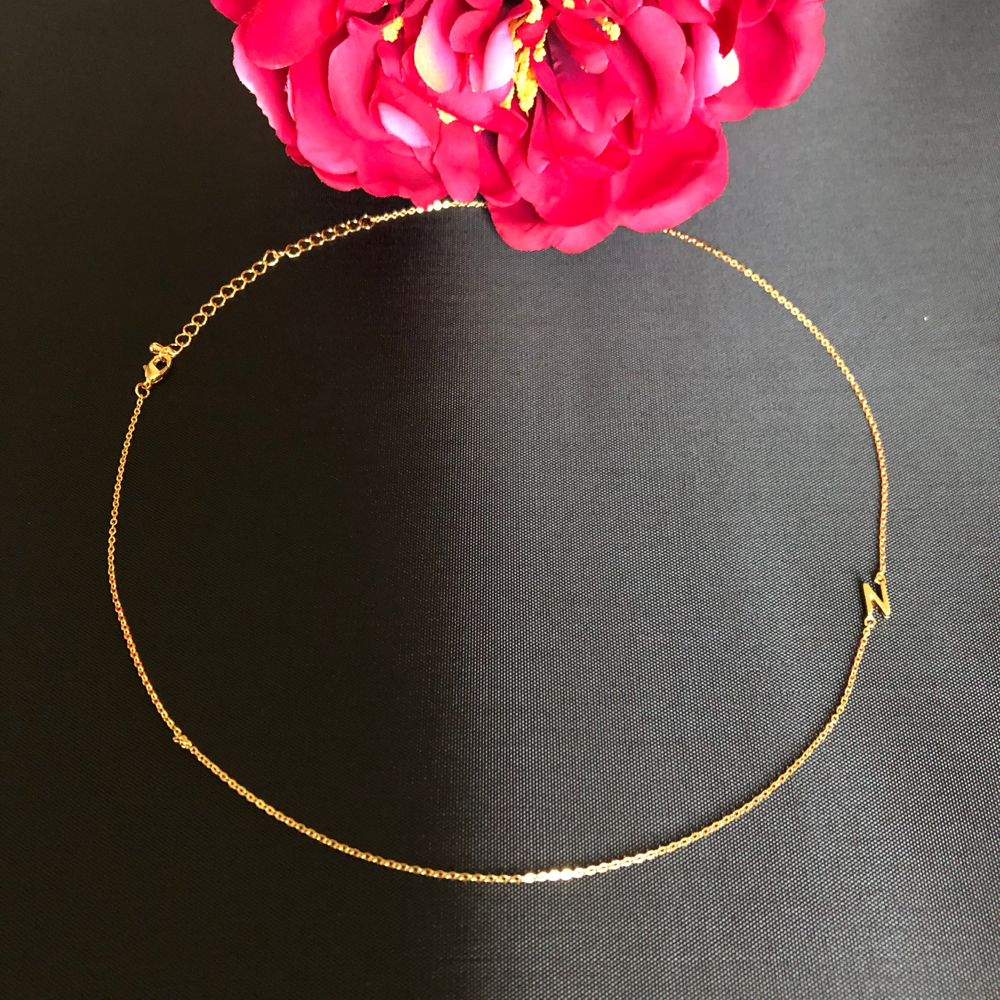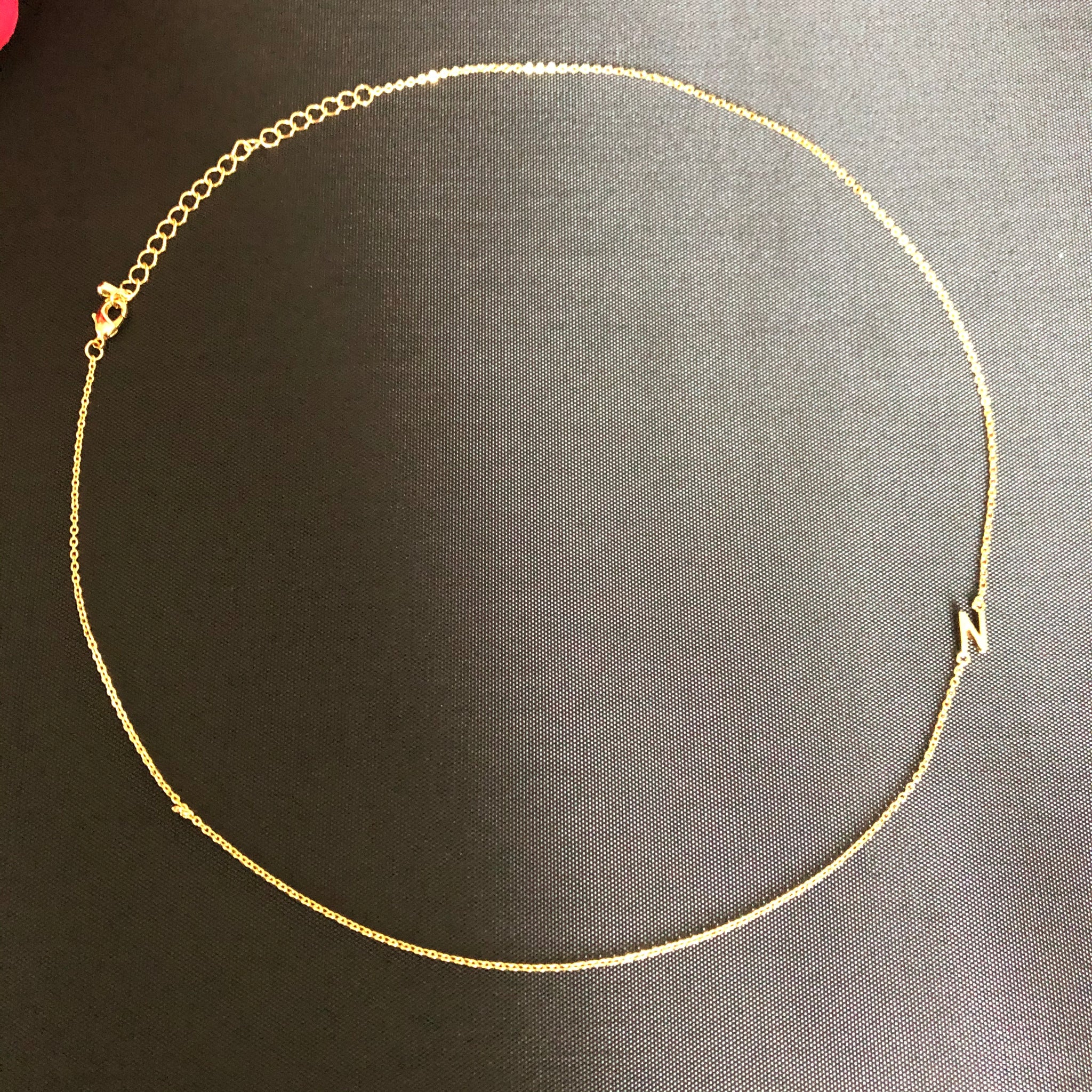 This is a delicate and luxurious little necklet made from 18K Rolled Gold. What makes it unique is that the initial hangs fashionably on the side rather than at the bottom and the initial can be worn either on the left or the right side of the neckline.