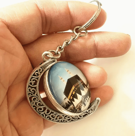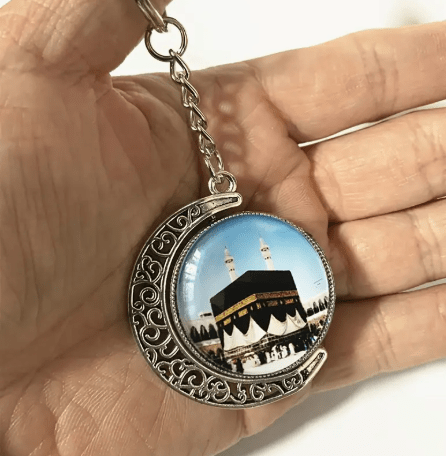 Rotating Double-Sided Moon-Shaped Keychain With Sacred Kaba in Mecca, Islamic Muslim Arabic Keyring For Men, Car And Bag Accessory