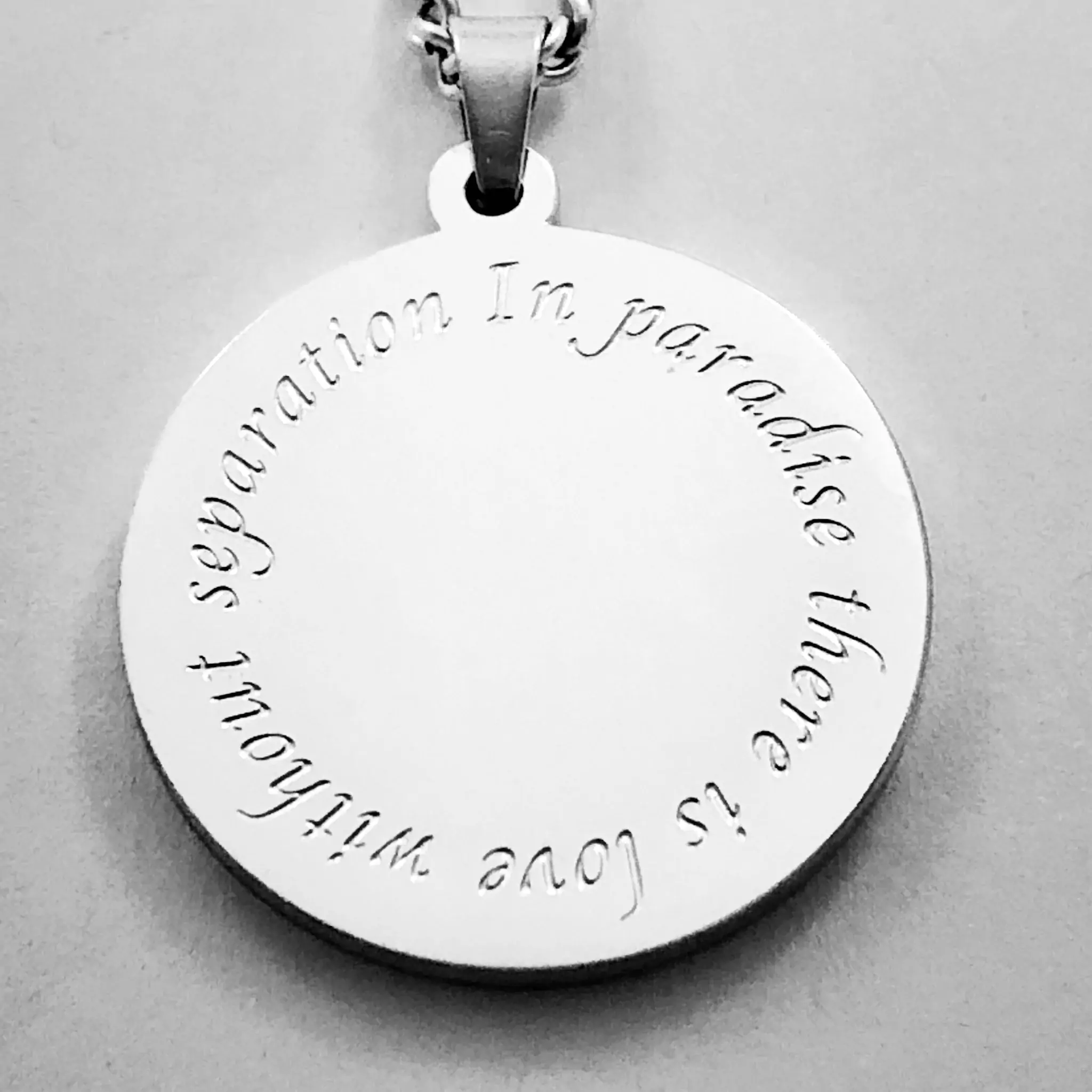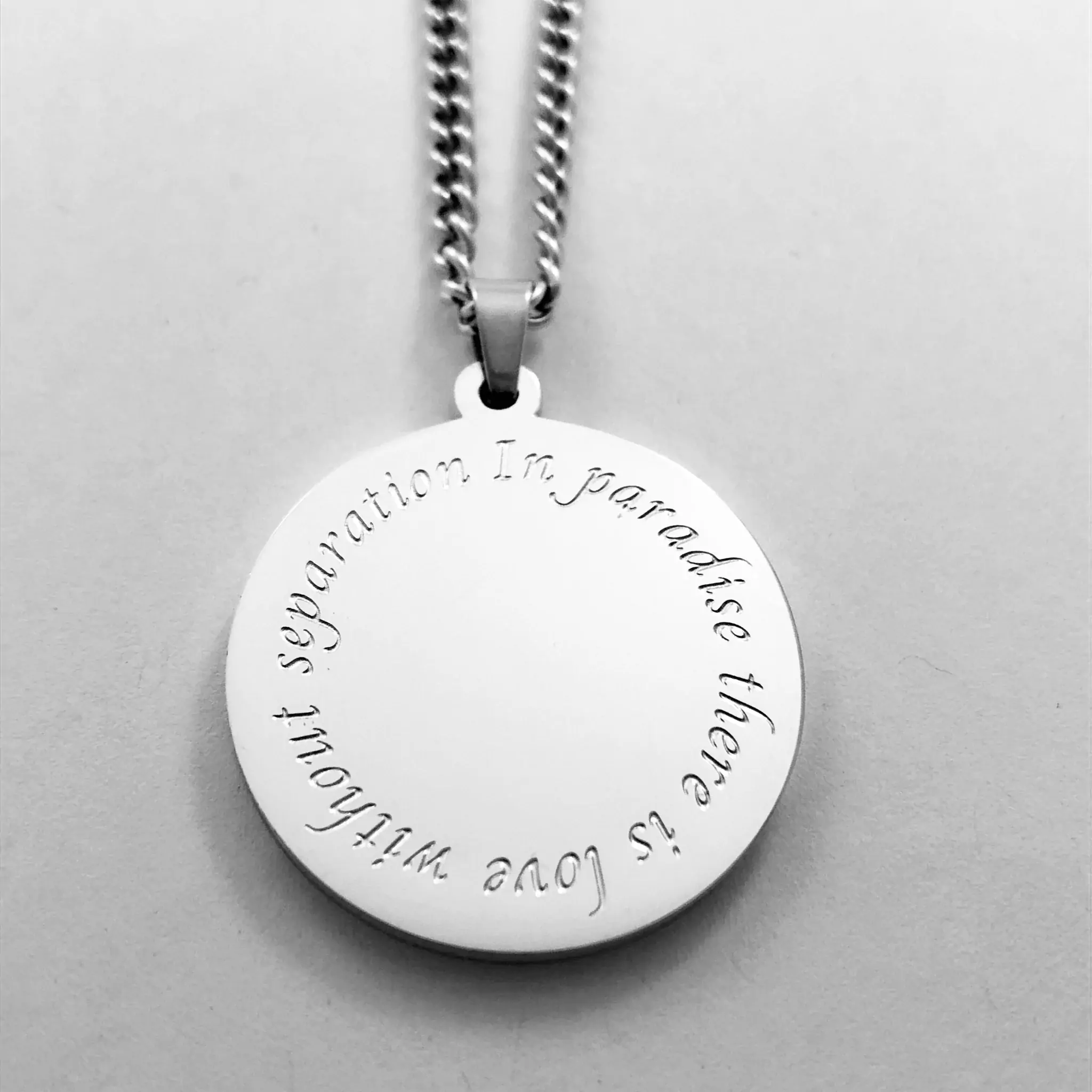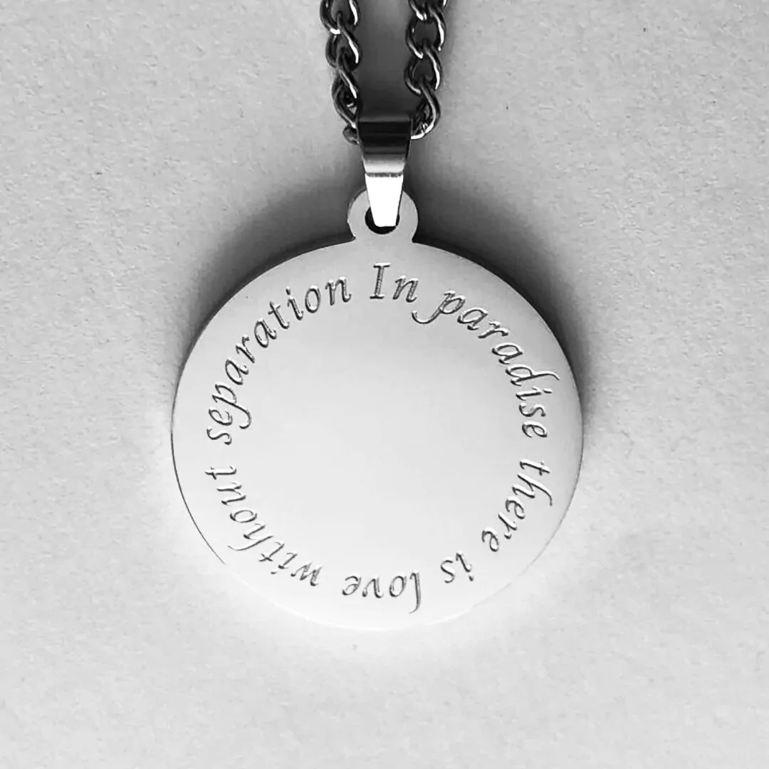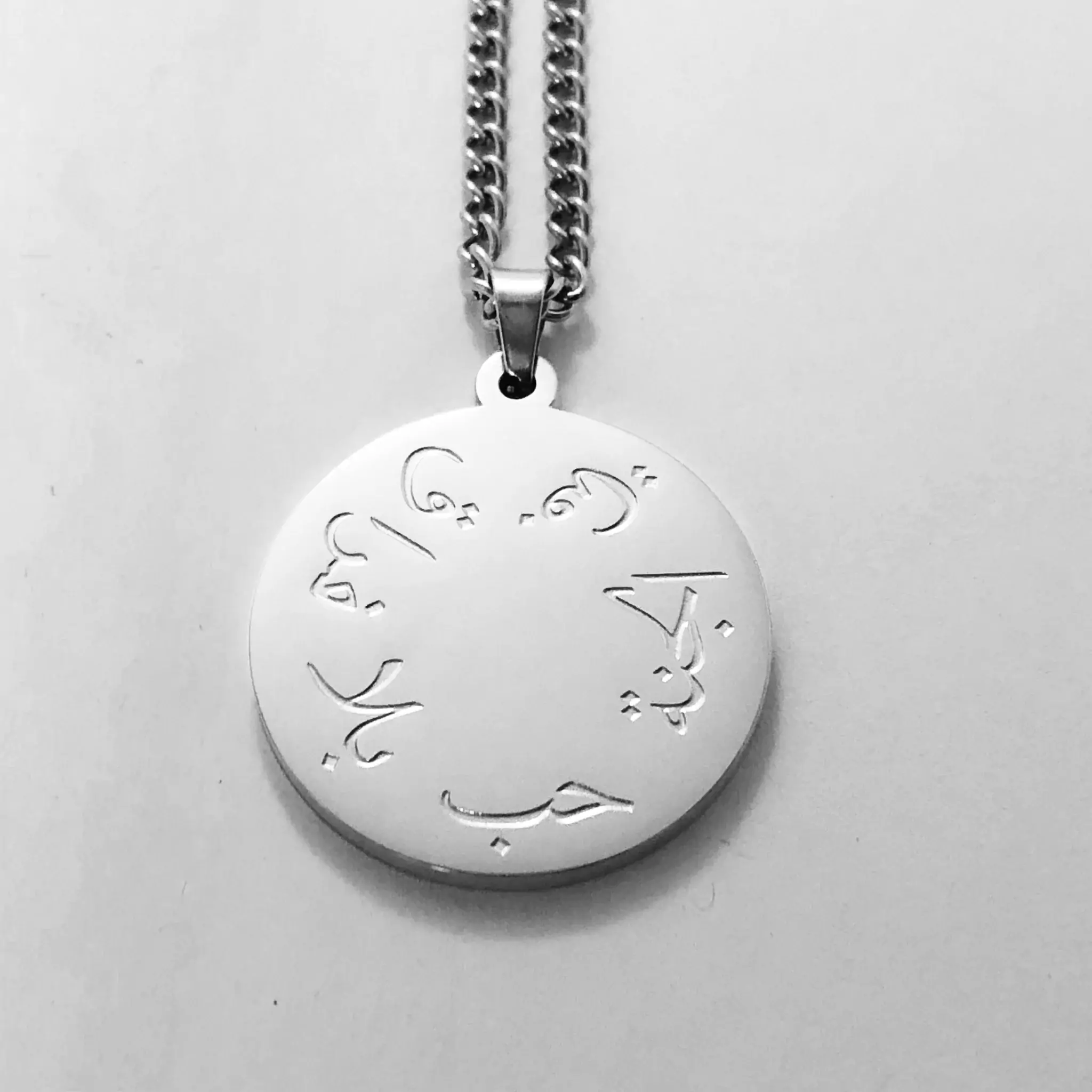 This special necklace is charmingly engraved with the Arabic proverb “In paradise there is love without separation”. One side of the pendant is engraved with Arabic lettering and the other side is engraved with the English meaning, making this a very unusual piece and a definite conversation starter.