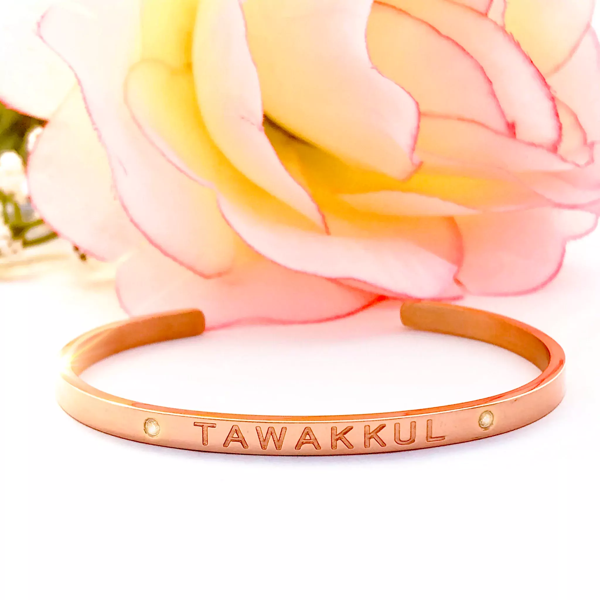 This elegant and contemporary cuff bangle has a timely reminder about 'Tawakkul' which is having reliance and trust in Allah (God) alone. The Arabic word 'Tawakkul' is engraved into the exquisite and rich rose gold of the bangle.
