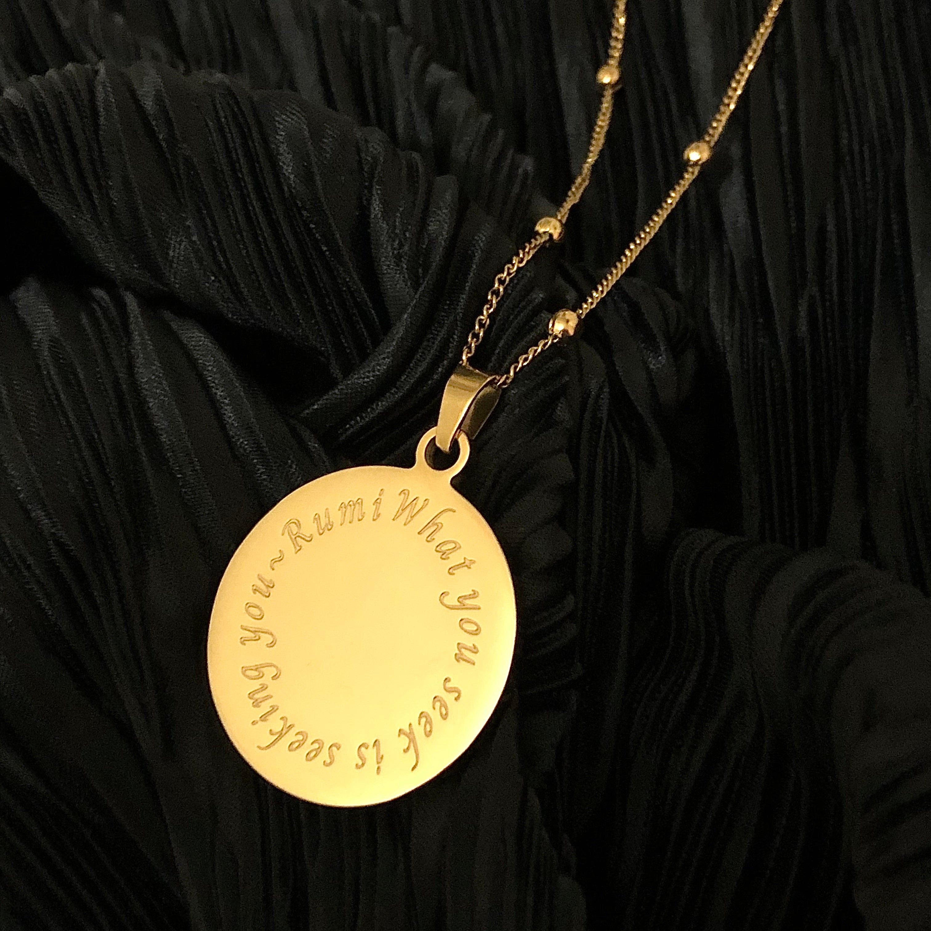 This stunning Yellow Gold necklace is engraved with the inspirational Rumi quote: "What you seek is seeking you". It is one of the most well known and often quoted Rumi quotes in the world.