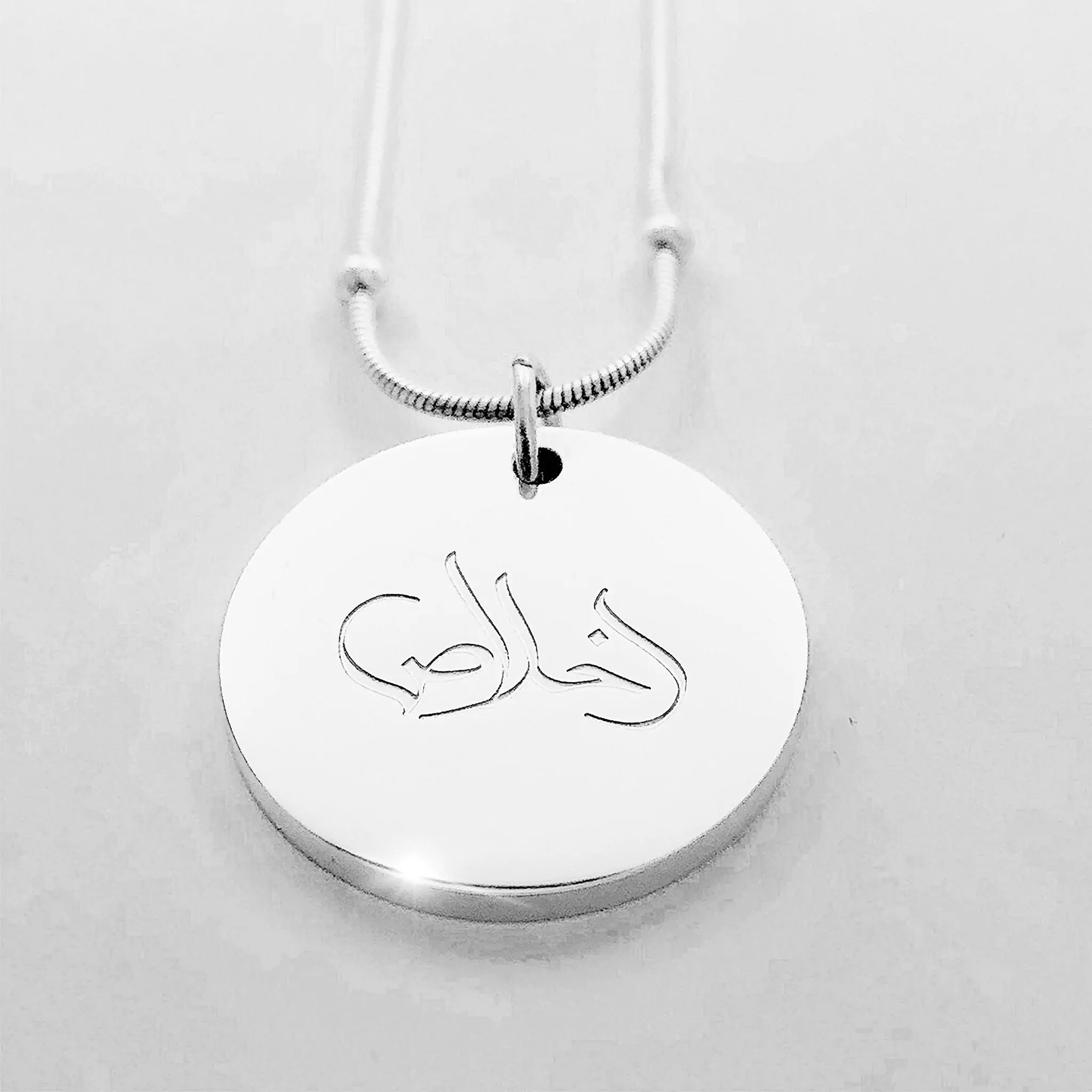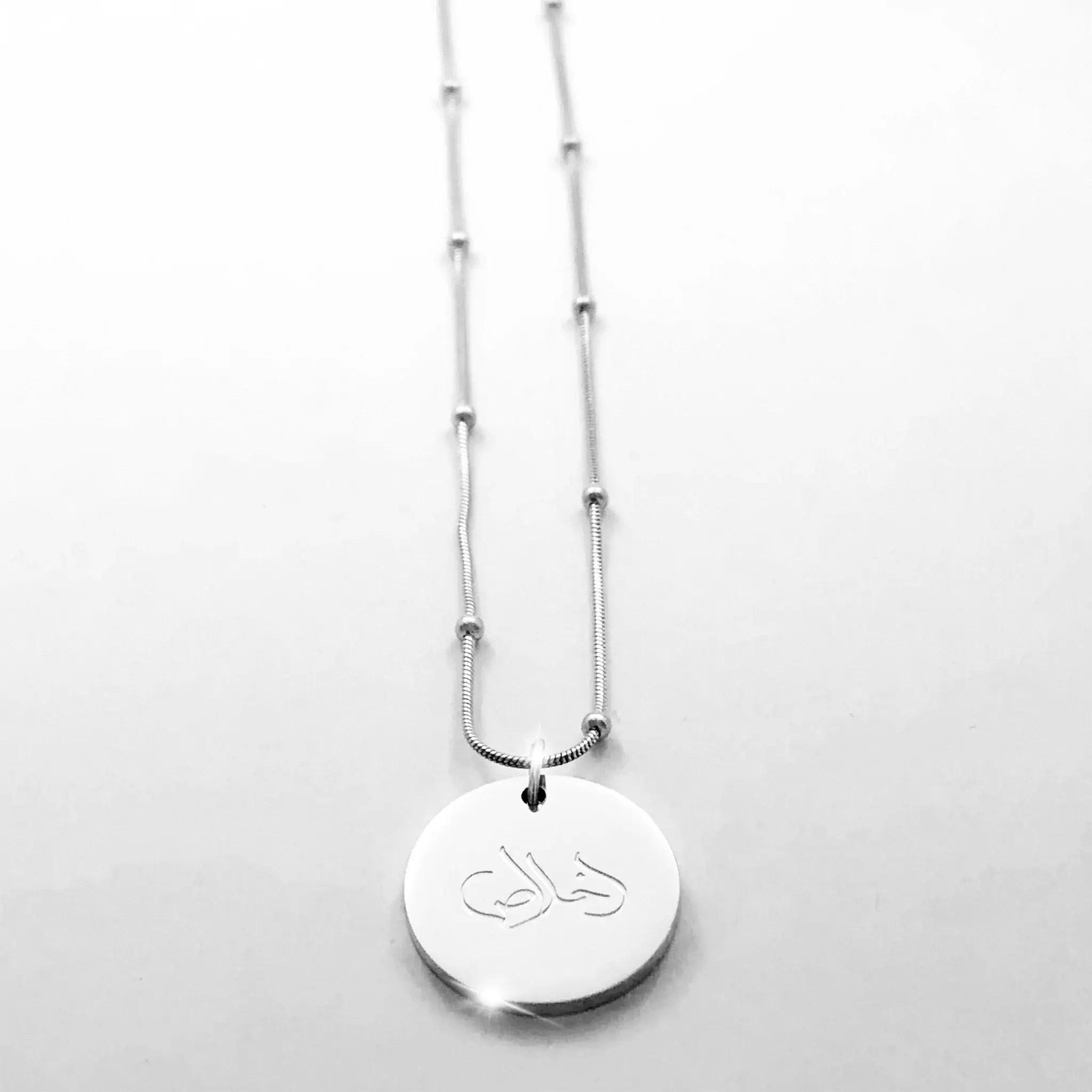 This gorgeous calligraphy necklace is delicately engraved with the Arabic word “Ikhlas” which means “Sincerity” and relates both to our relationship with God and other people.