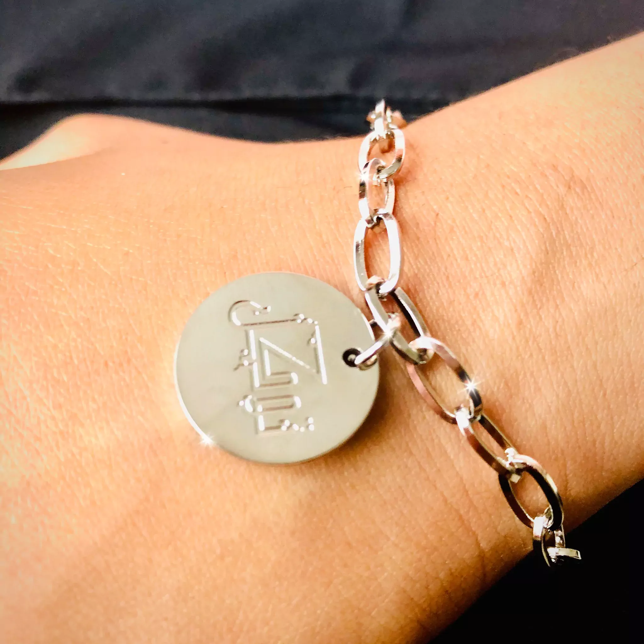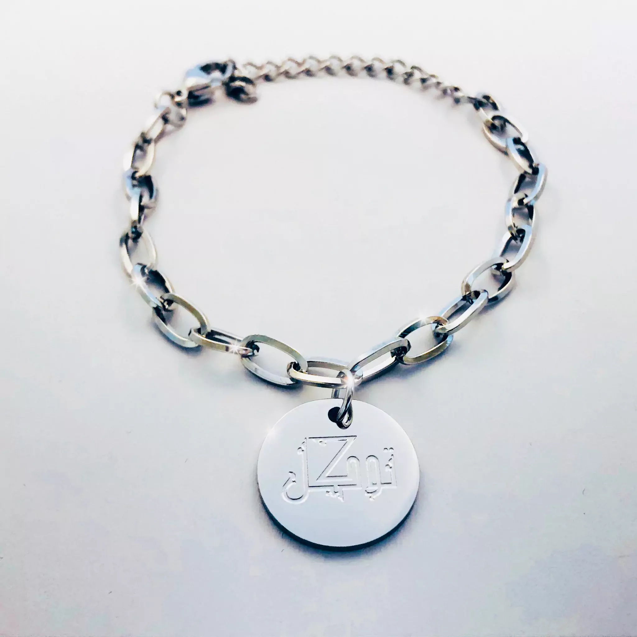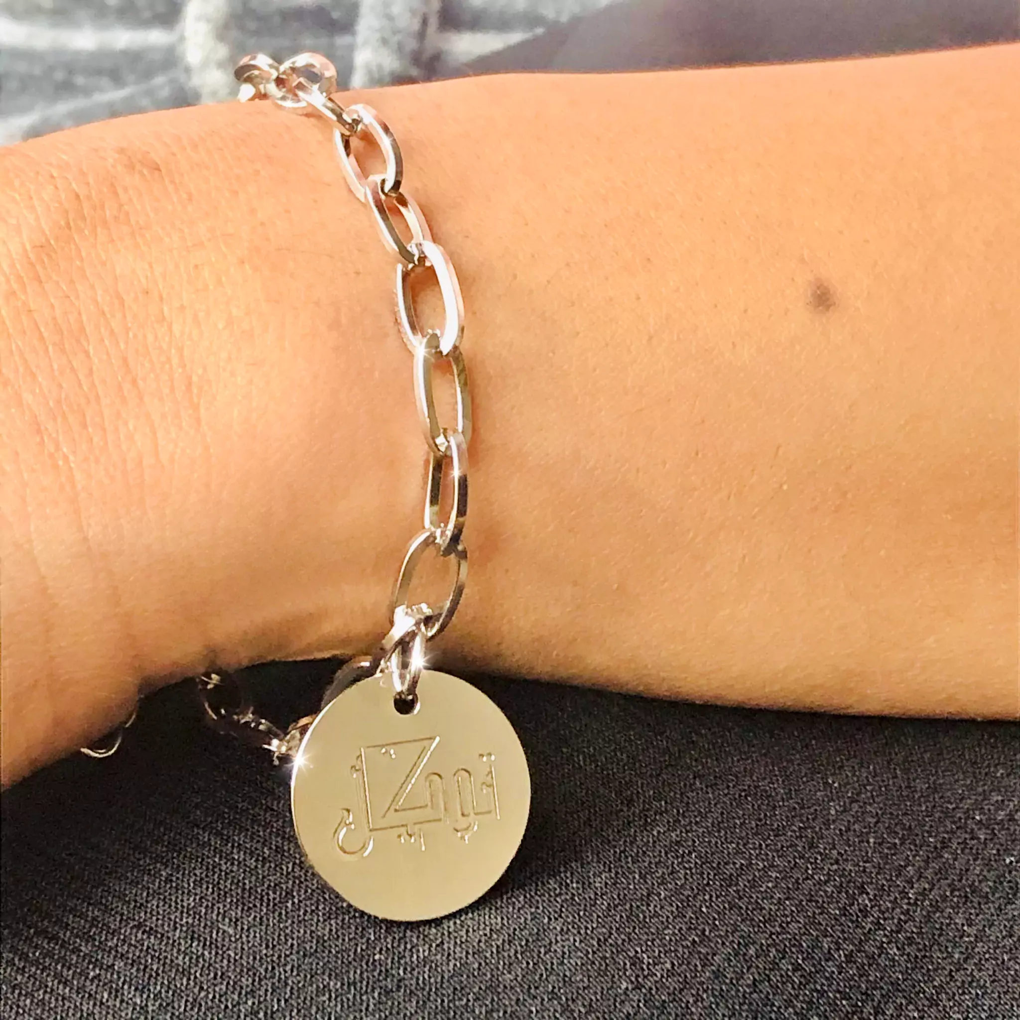 This stunning bracelet has a contemporary link chain design with a beautifully engraved charm dangling alluringly off the wrist. The charm has the Arabic word “Tawakkul” engraved on it in an artistic calligraphy design.
