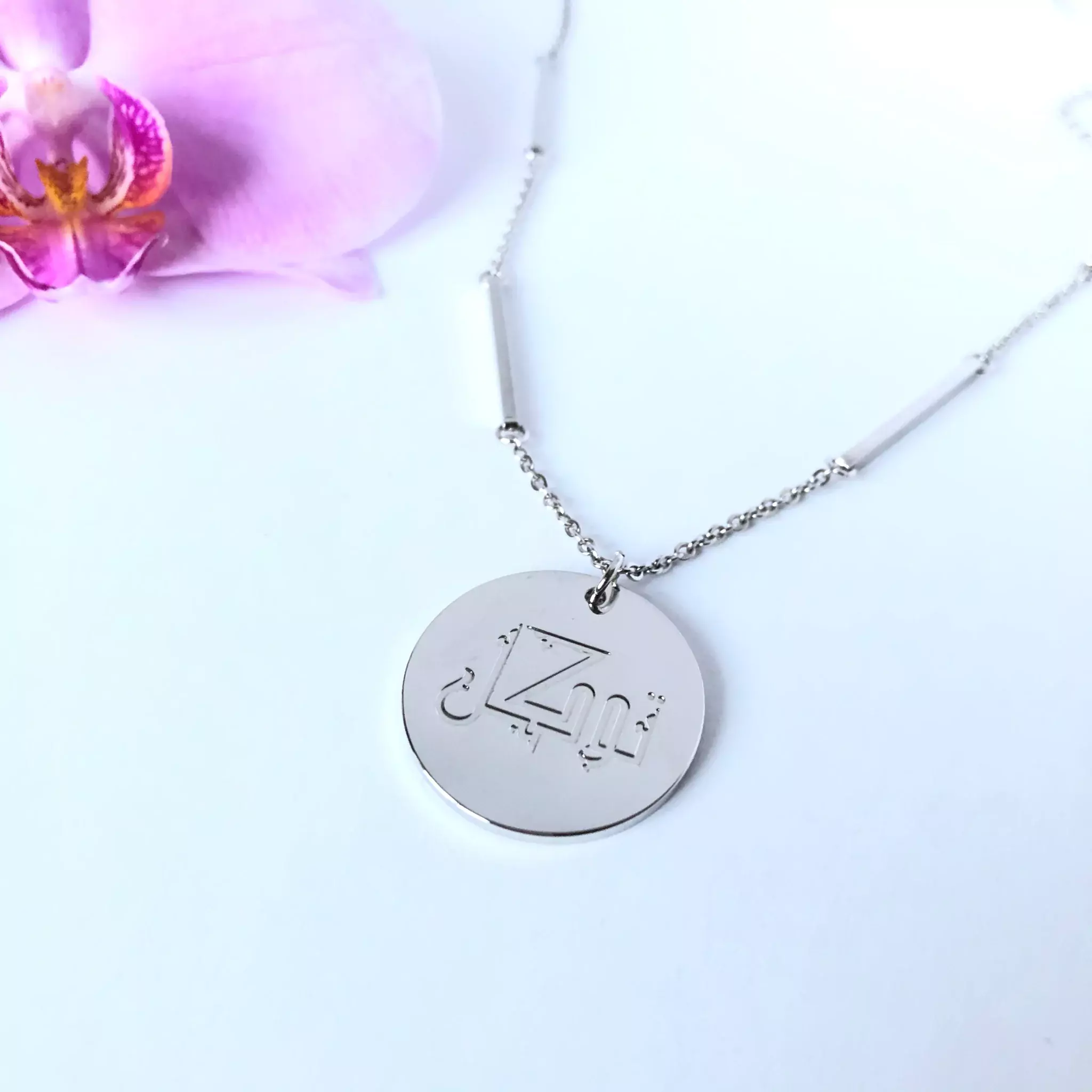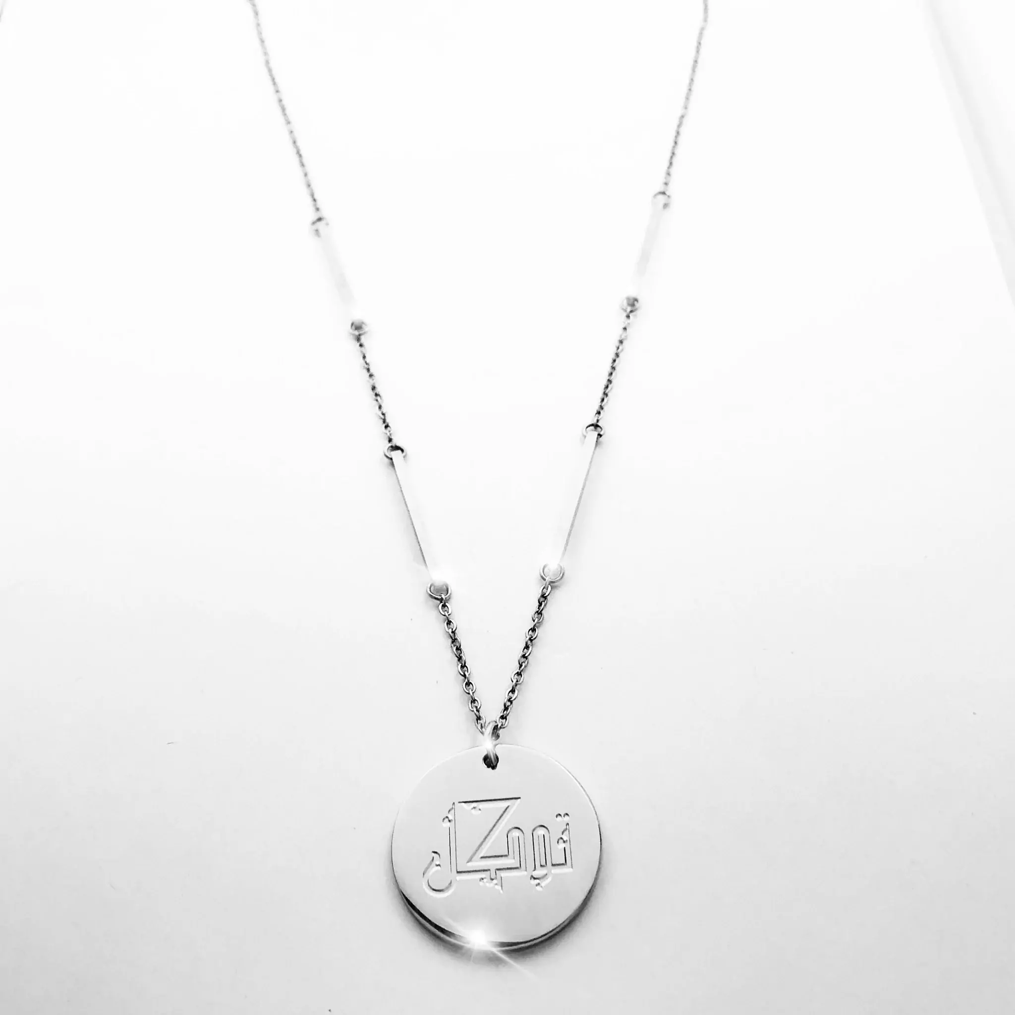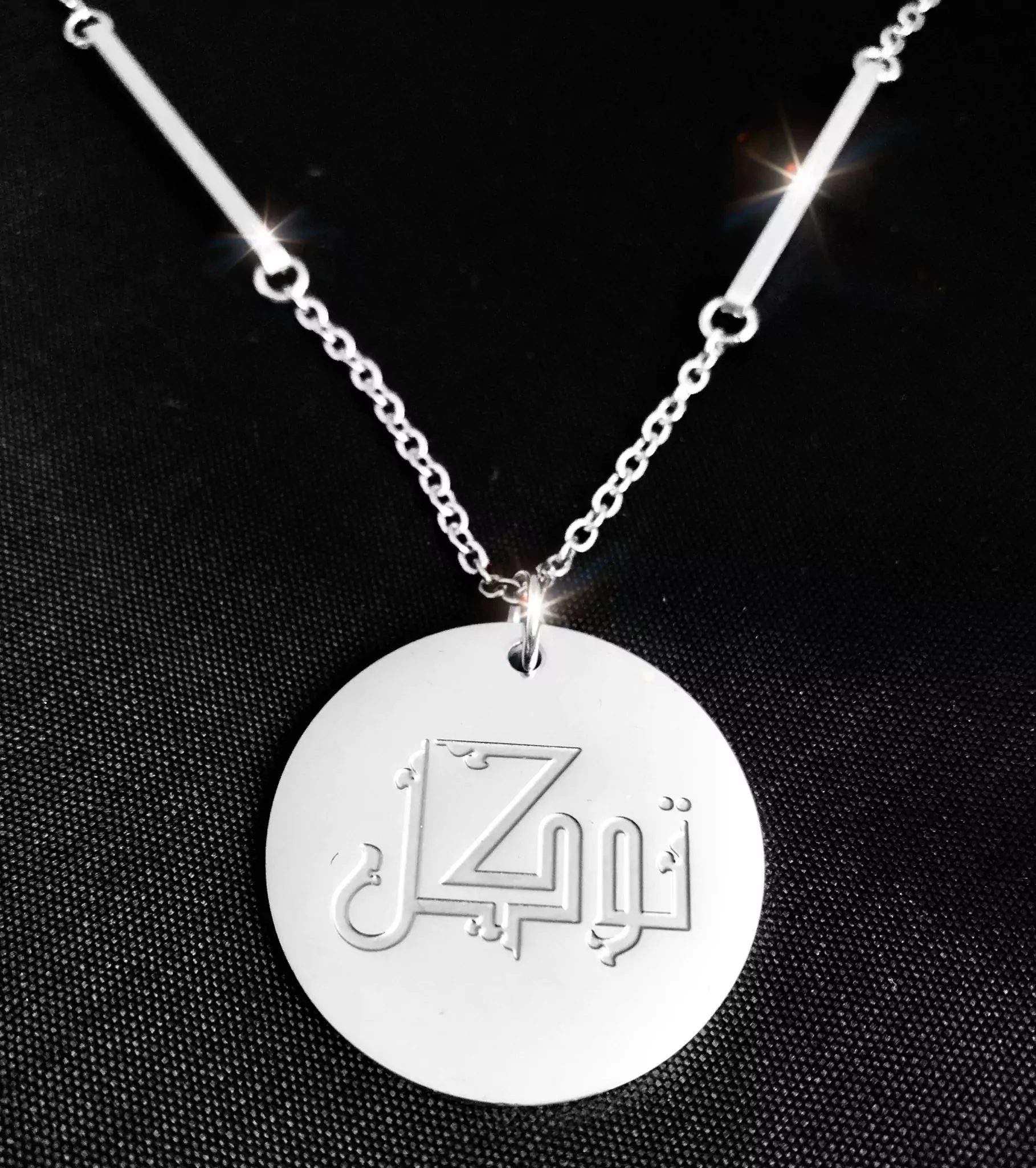 This beautiful and elegant necklace is engraved with the Arabic word “Tawakkul” in a stunning calligraphy design.