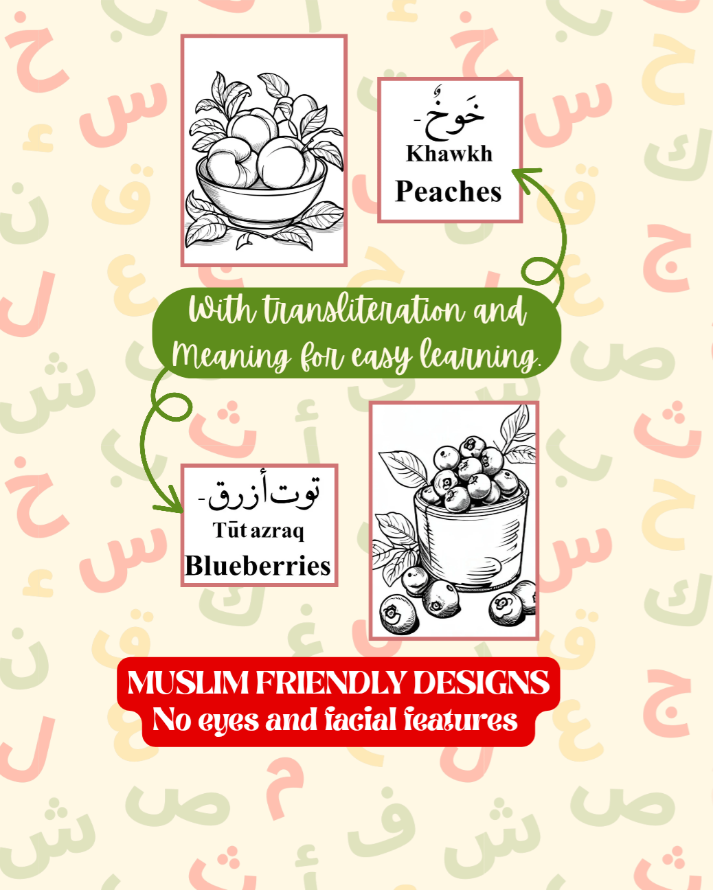 This unique colouring book features pages filled with delightful fruit designs paired with Arabic vocabulary, designed to make language learning feel effortless and engaging for all ages.