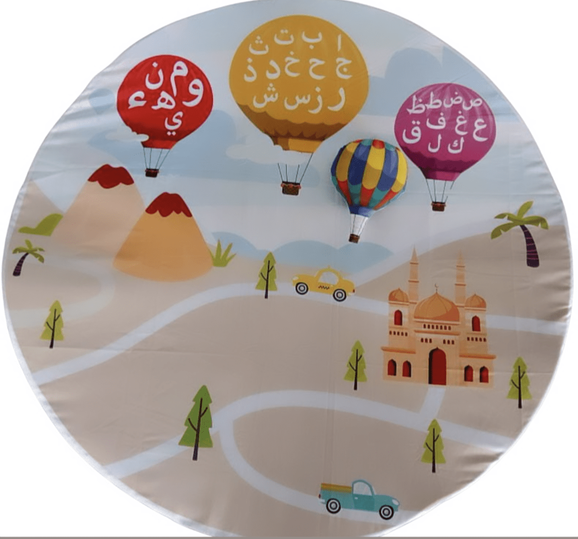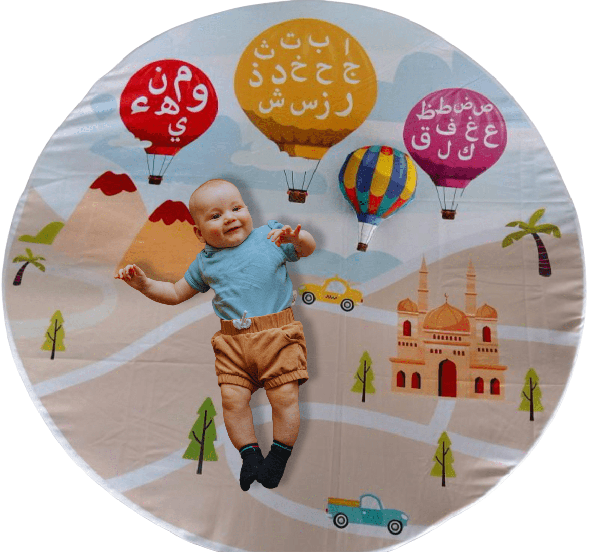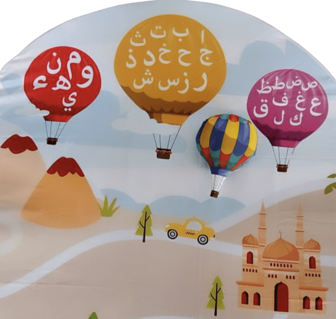 Enhance your child's playtime with our colourful Arabic Alphabet playmat featuring a beautiful hot air balloon design.