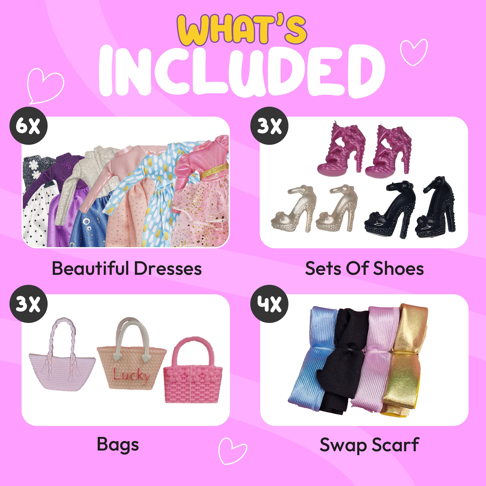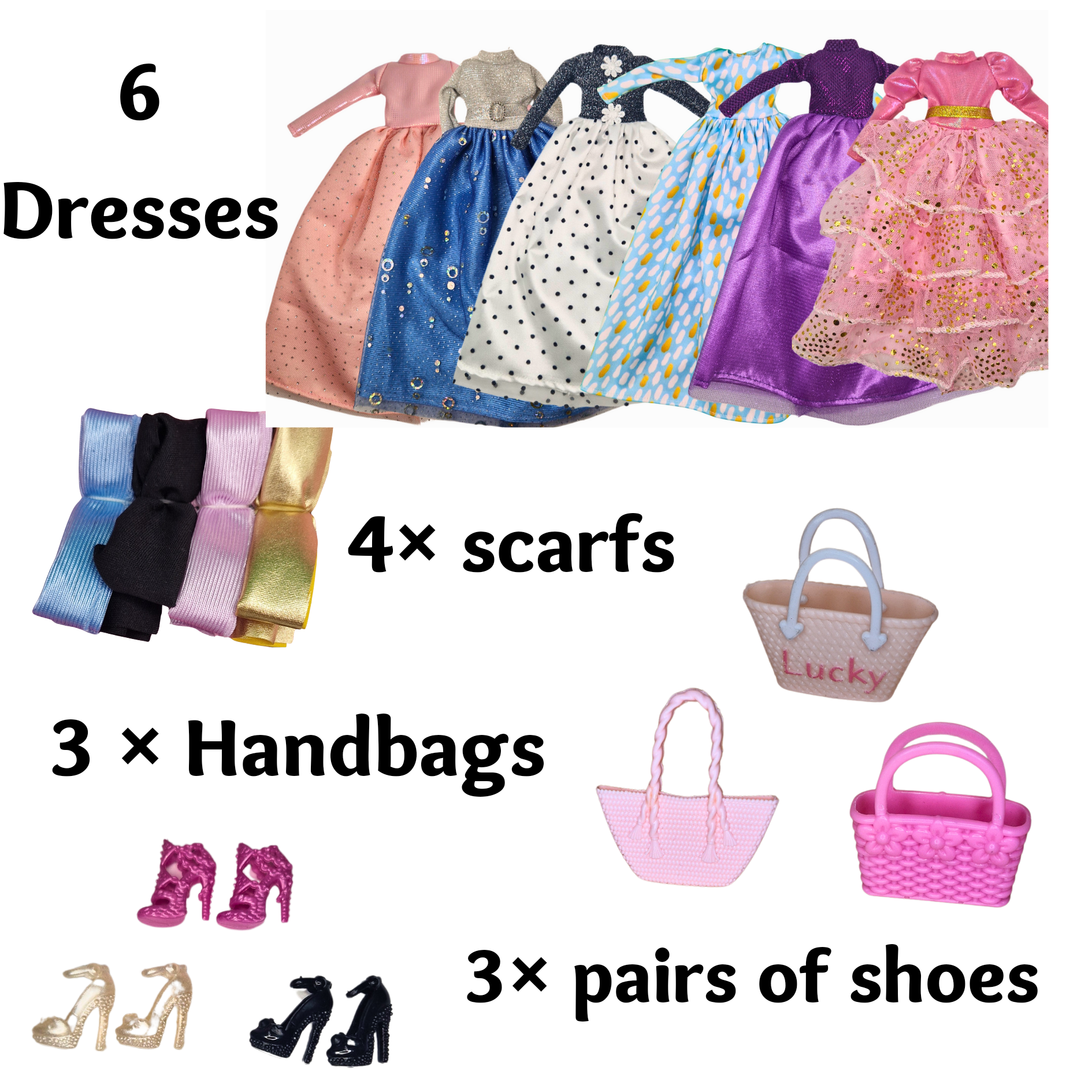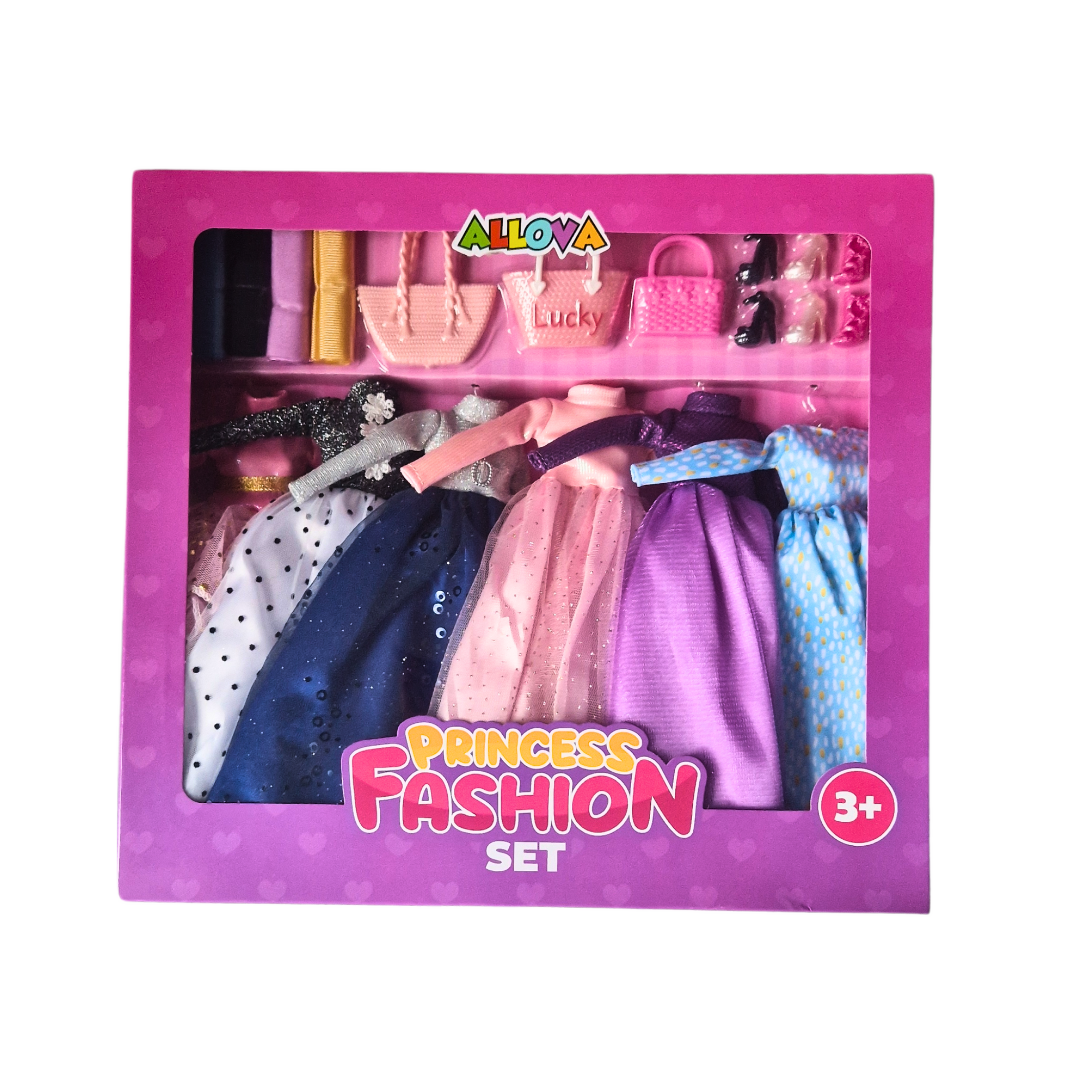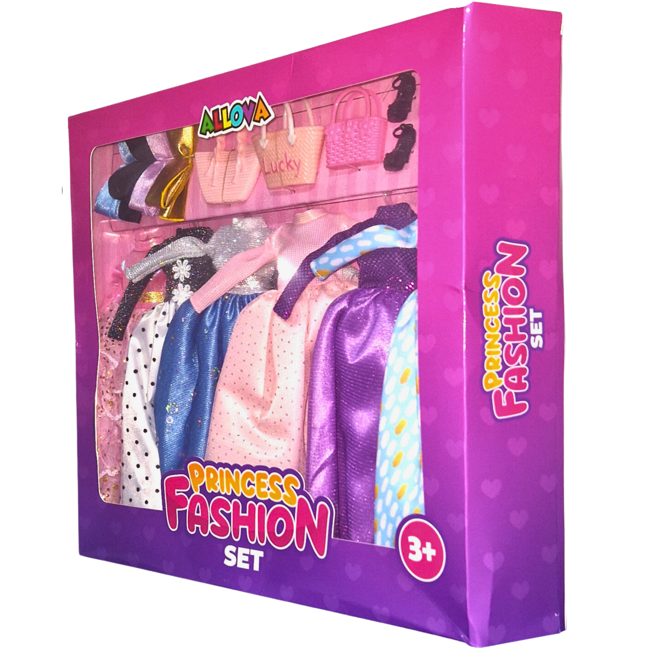 This set includes 6 elegantly designed Princess Dresses, 3 pairs of stylish shoes, 4 vibrant scarves, and 3 chic handbags. Each piece is thoughtfully crafted, making it easy for little hands to dress and accessorize their dolls. With such a wide array of options, your child’s dolls will always be dressed to impress!