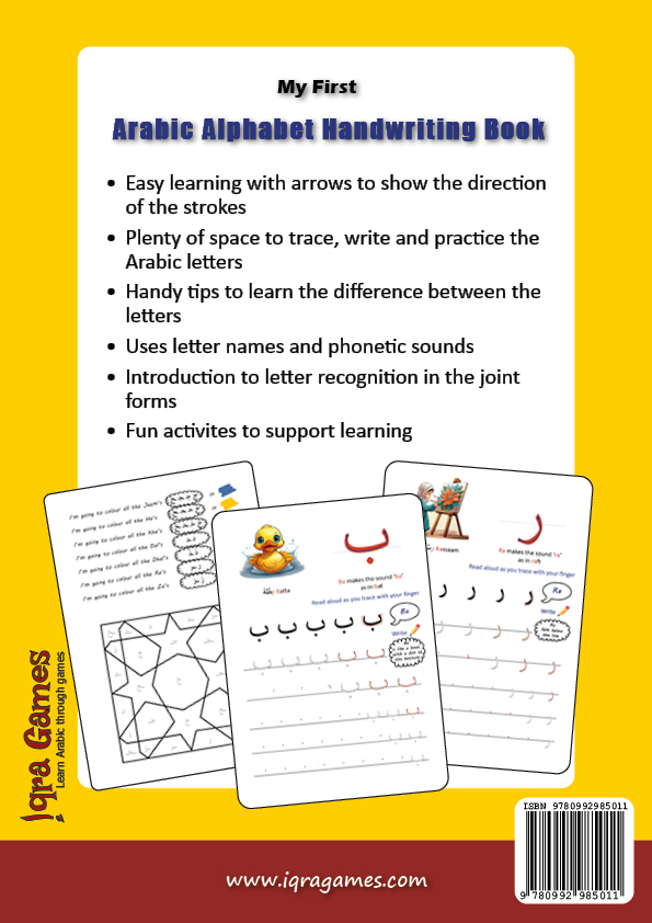 This first Arabic Alphabet Handwriting book is ideal for children taking their first steps in writing the Arabic letters. It has bright colourful pictures on each page making the activities engaging for young learners. There is a page to trace, write and practice each letter of the alphabet (Alif, Ba, Ta...) with fun activities to support learning.