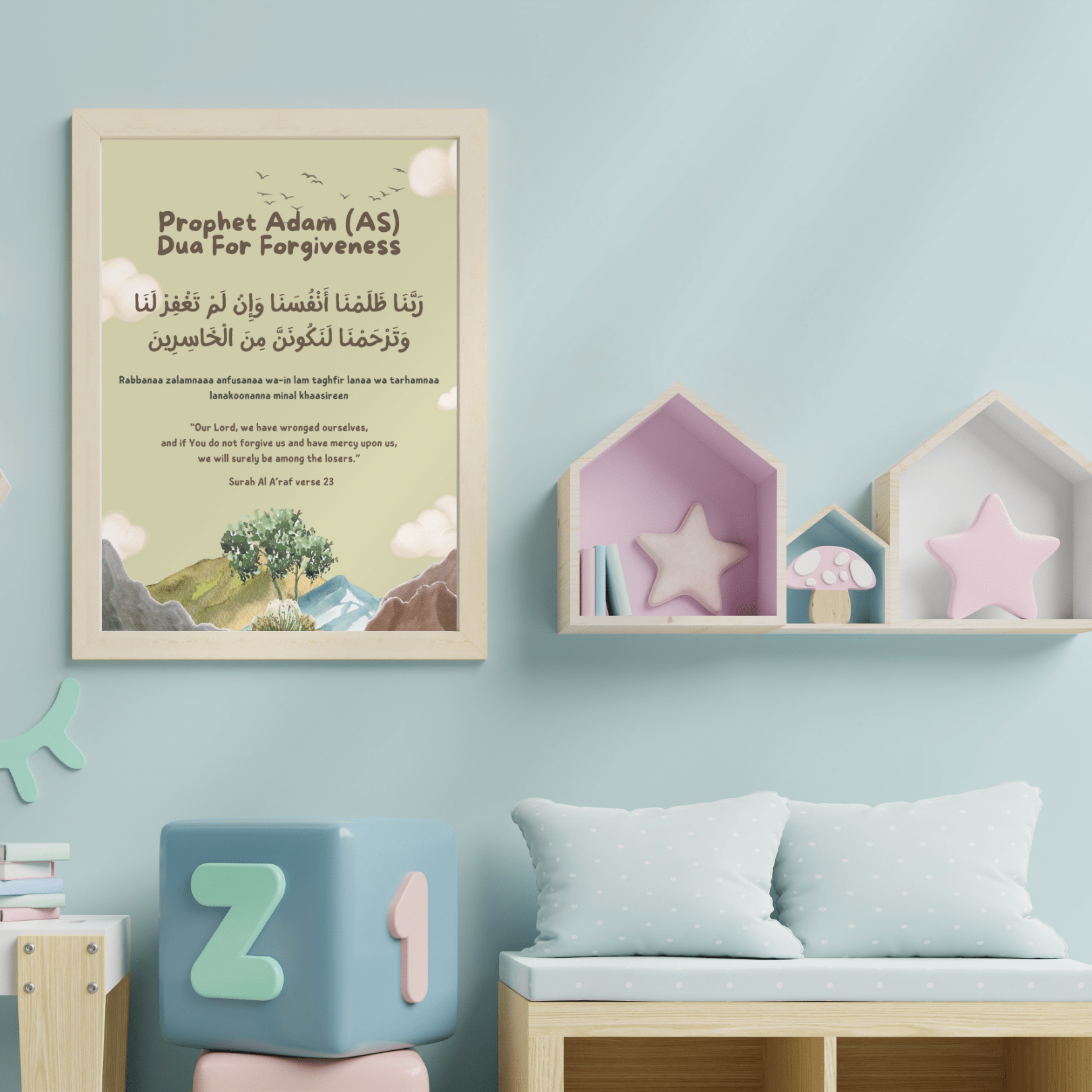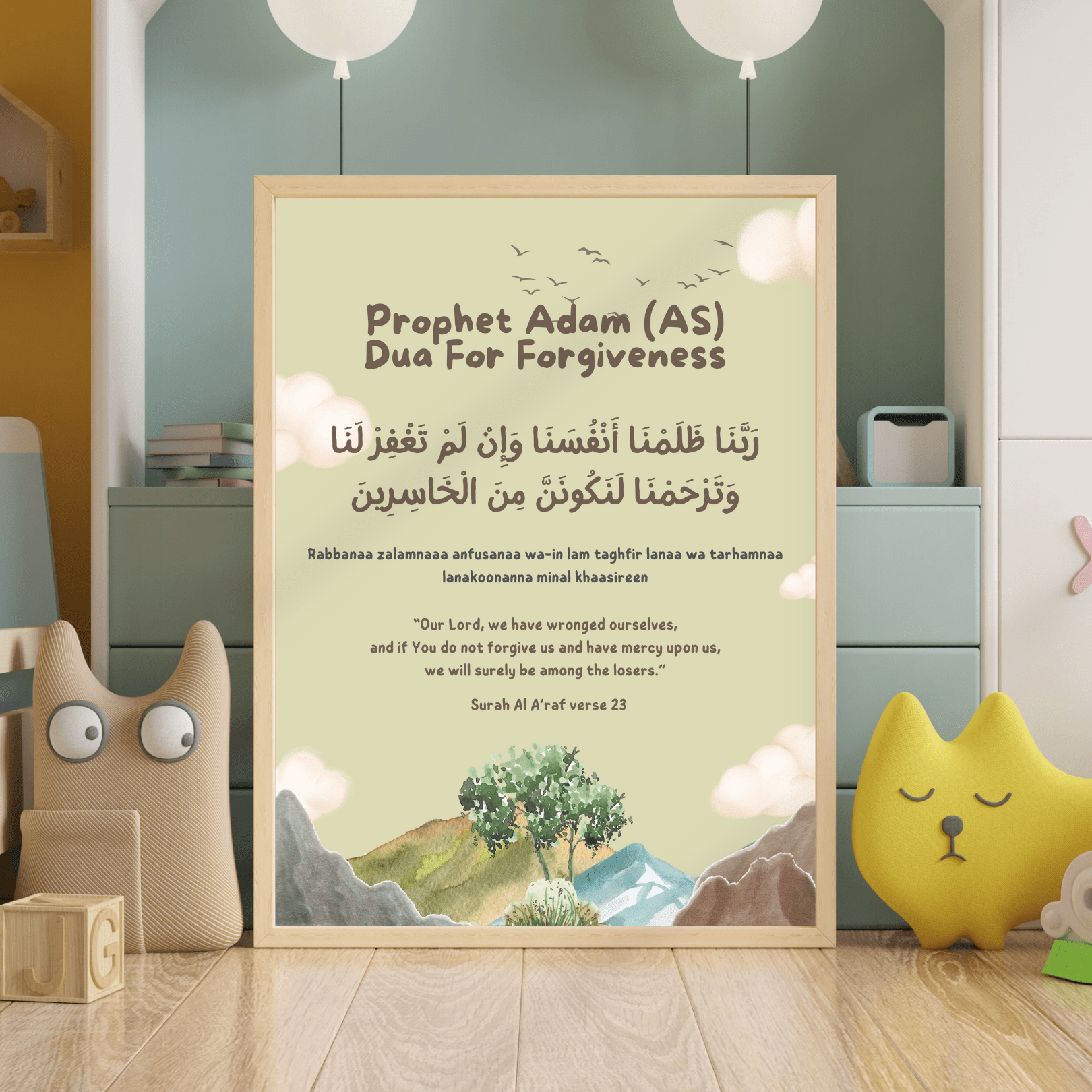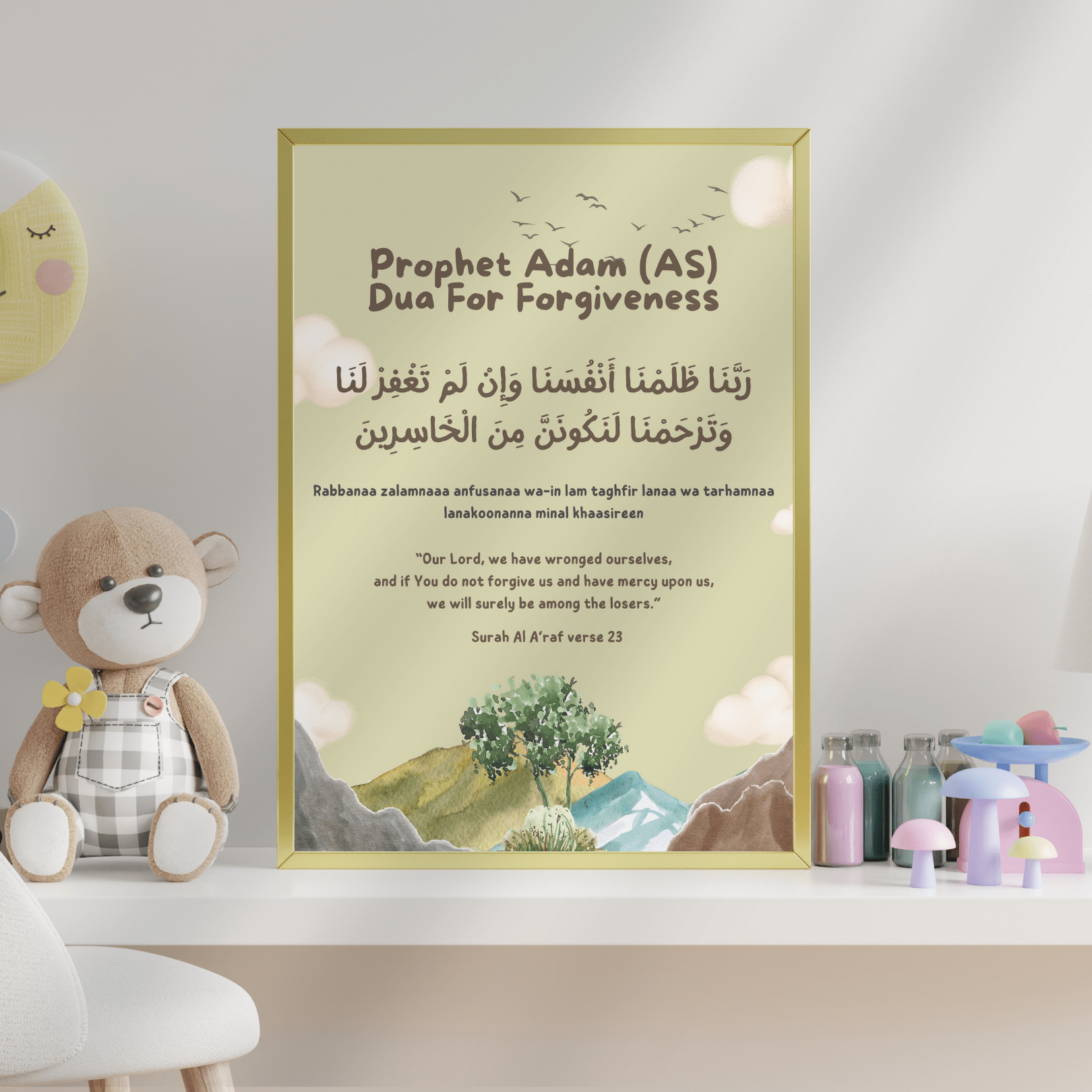 Transform your child's surroundings into a haven of faith and inspiration with our Dua of Prophet Adam (AS) for Children Islamic wall art digital prints. Order now and let the blessings of this sacred supplication adorn your home.