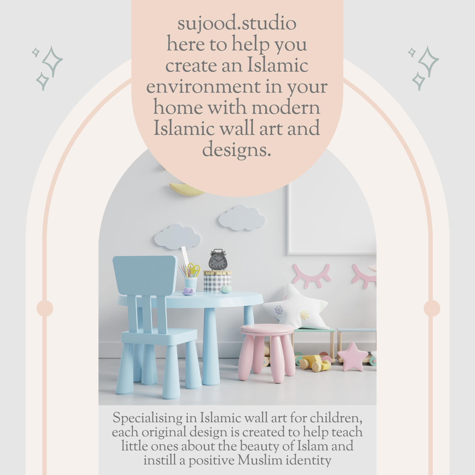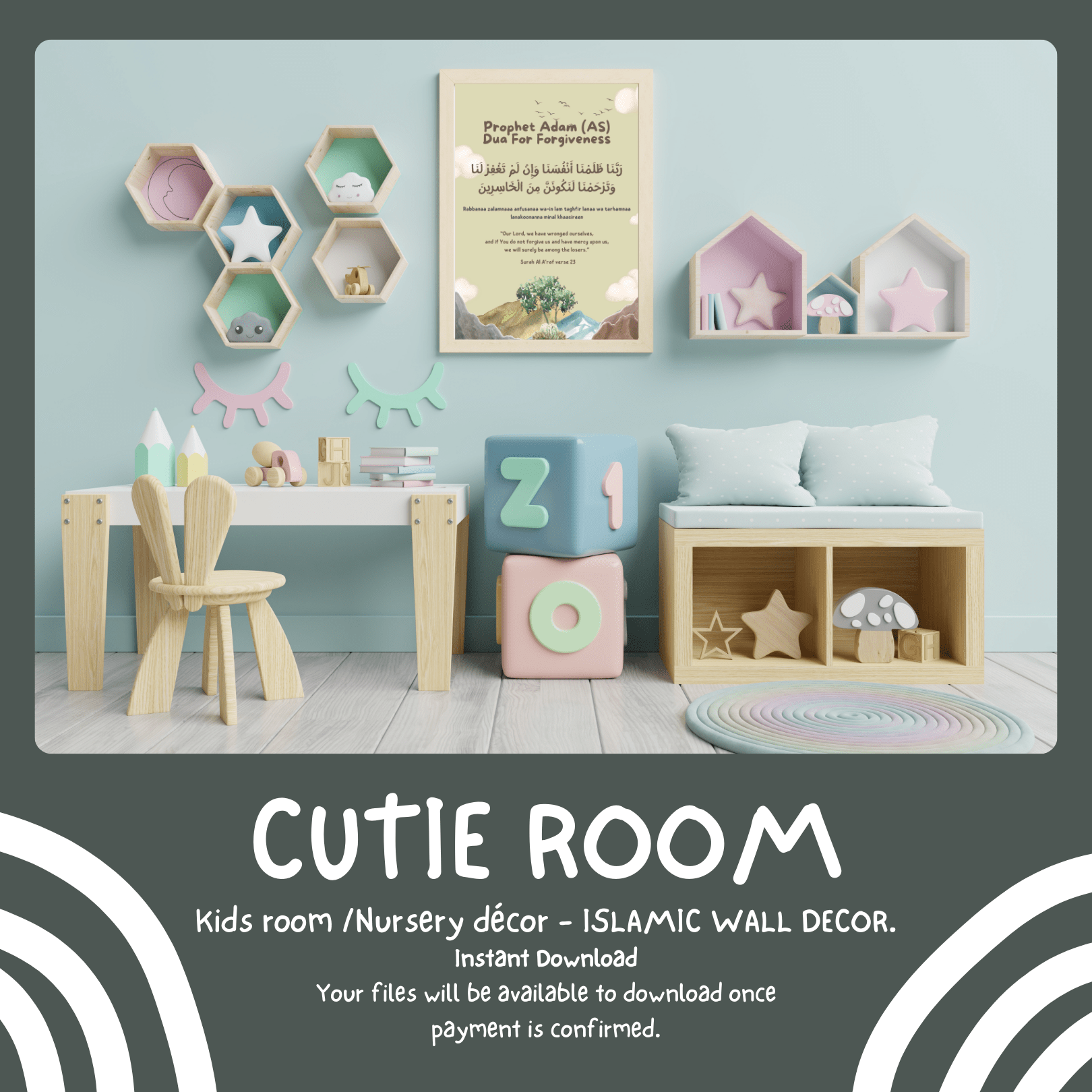 Elevate your child's spiritual space with our enchanting Islamic wall art digital prints, featuring the timeless dua (prayer) of Prophet Adam (peace be upon him) seeking forgiveness from the Almighty. Crafted with love and care, these prints blend the beauty of Islamic calligraphy with child-friendly aesthetics, making them perfect for adorning your child's bedroom, play area, or study corner.