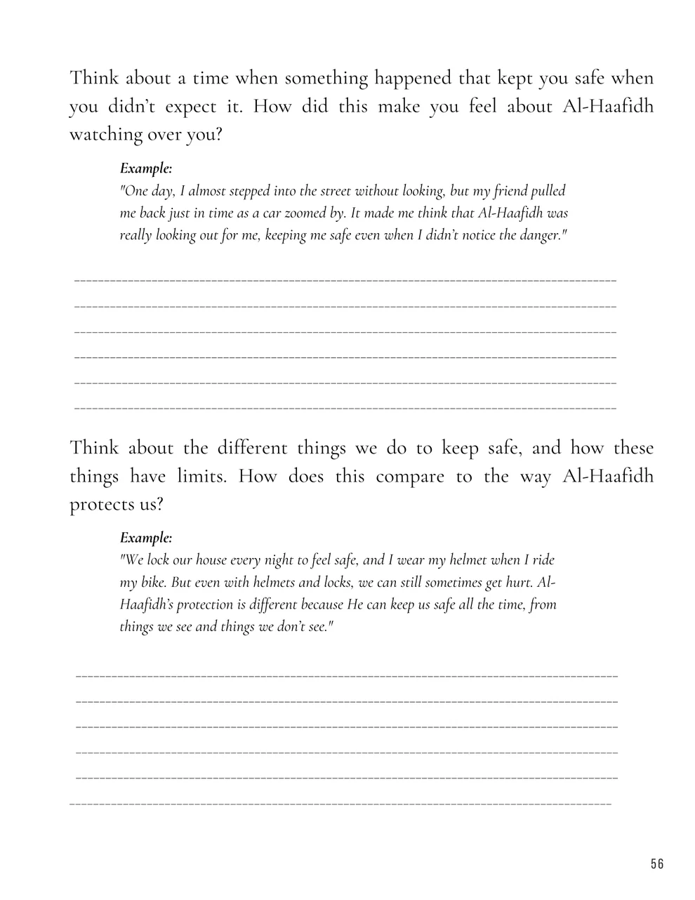 - Reflective Exercises: Fun activities and prompts to think about how Allah protects us and our world, encouraging thankfulness and trust.
