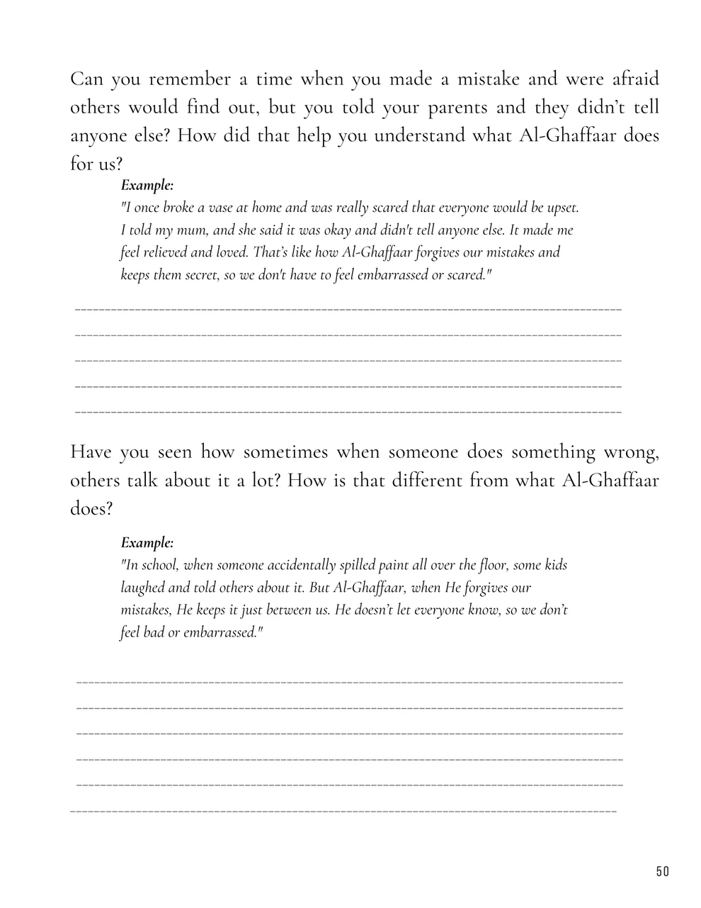 - Reflective Exercises: Fun activities and prompts to think about how Allah’s forgiveness impacts our lives, encouraging kids to seek forgiveness and show compassion to others.