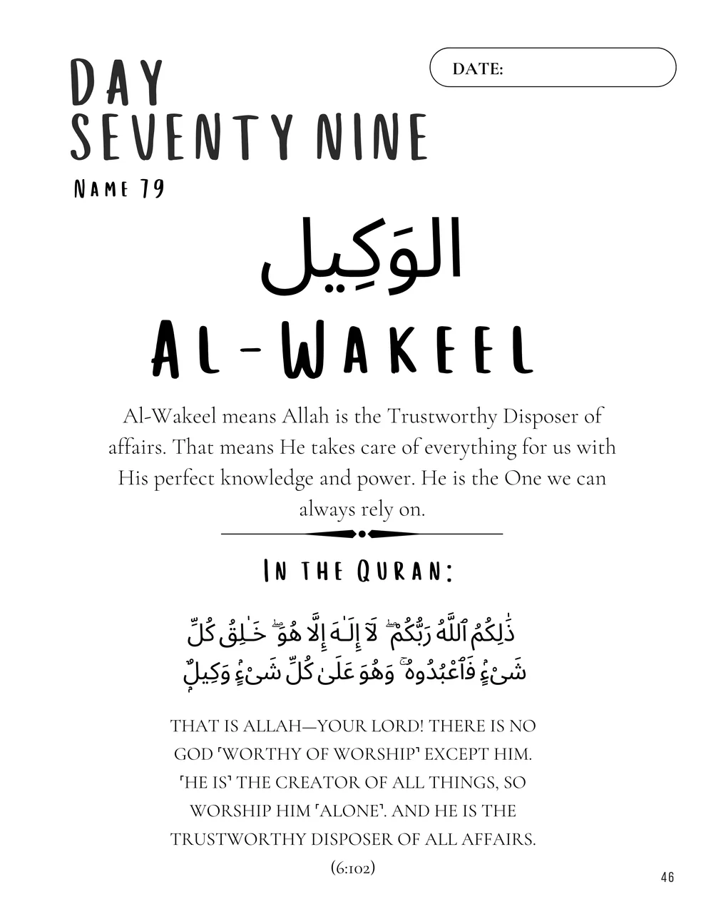 - Supplication Section: A special space to write prayers asking Al-Wakeel for guidance and support in all matters.