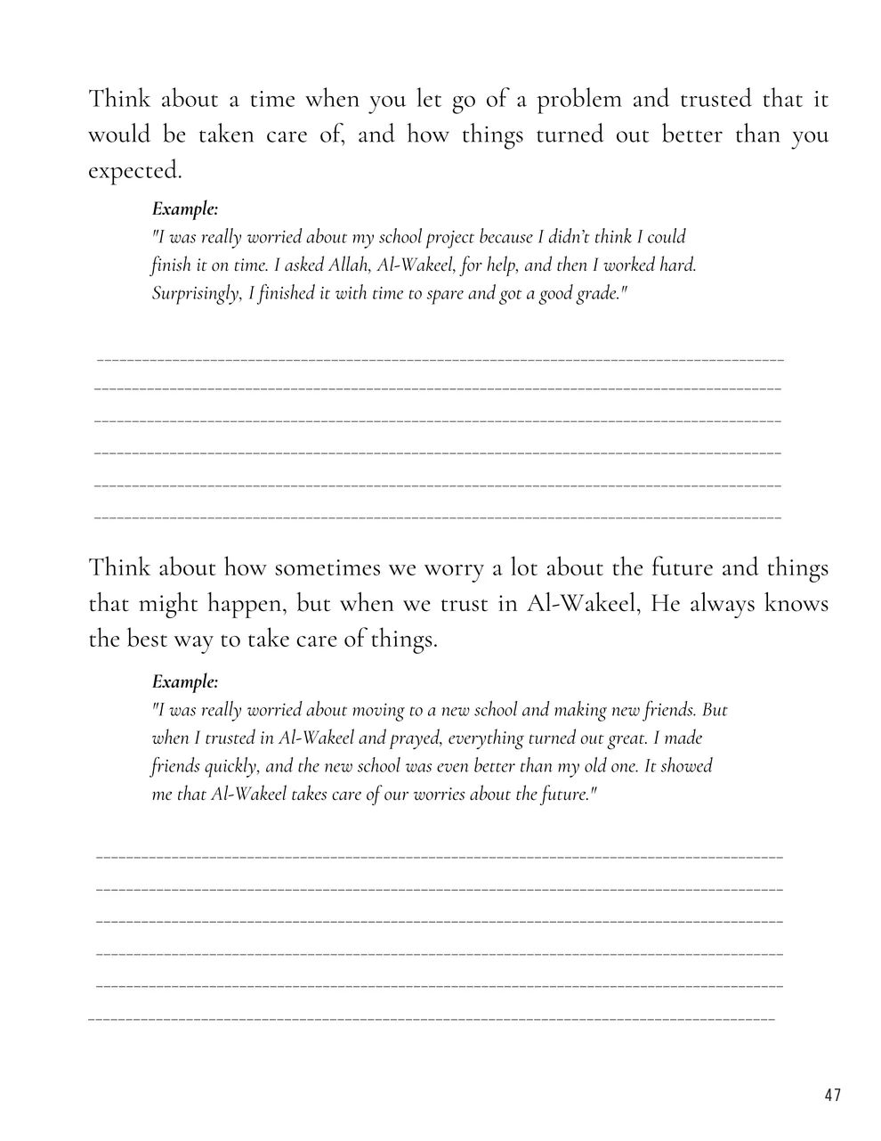- Reflective Exercises: Fun activities and prompts to think about how Allah manages our affairs, encouraging trust and reliance on Him.