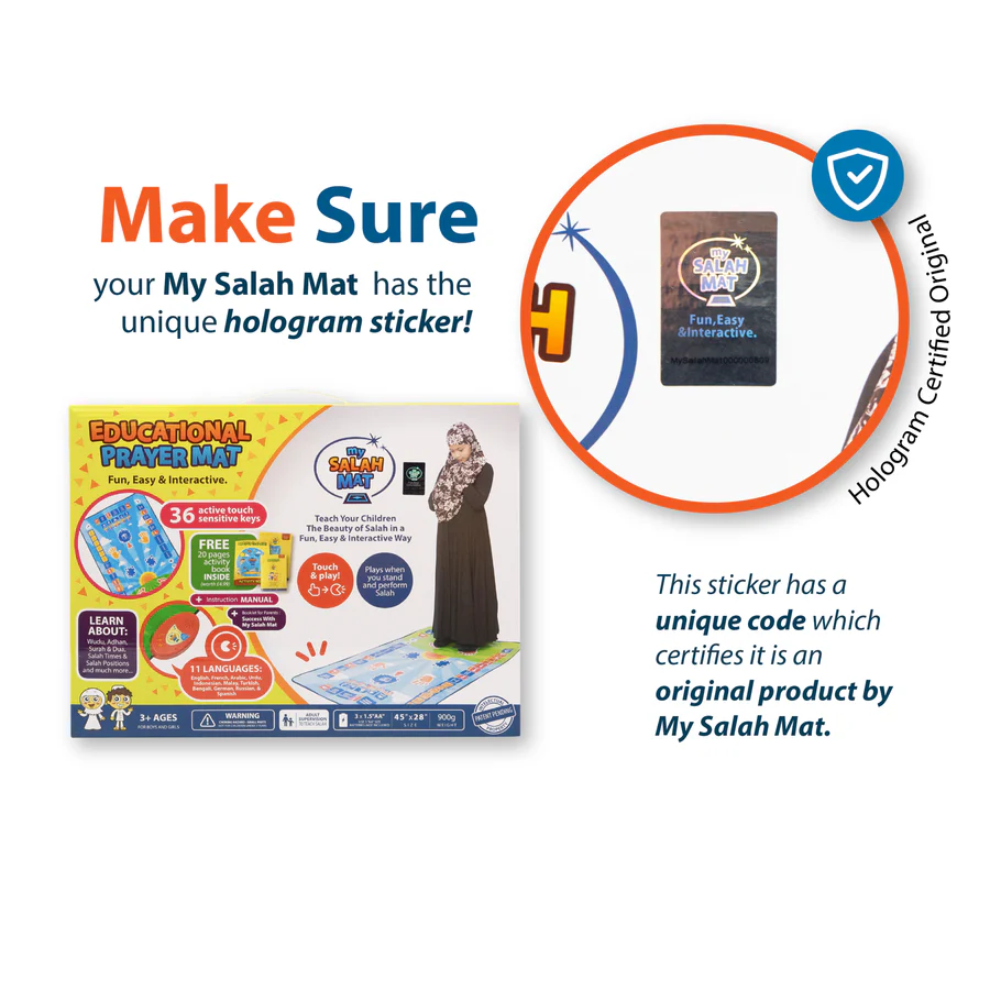 - HOLOGRAM STICKER – This certifies it’s an Original product and the code on the sticker can be used to further identify this on a database with My Salah Mat.
