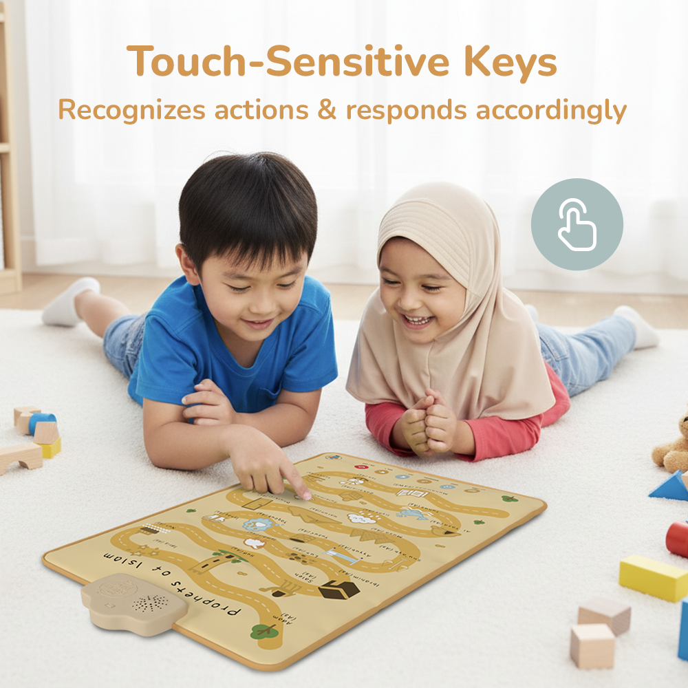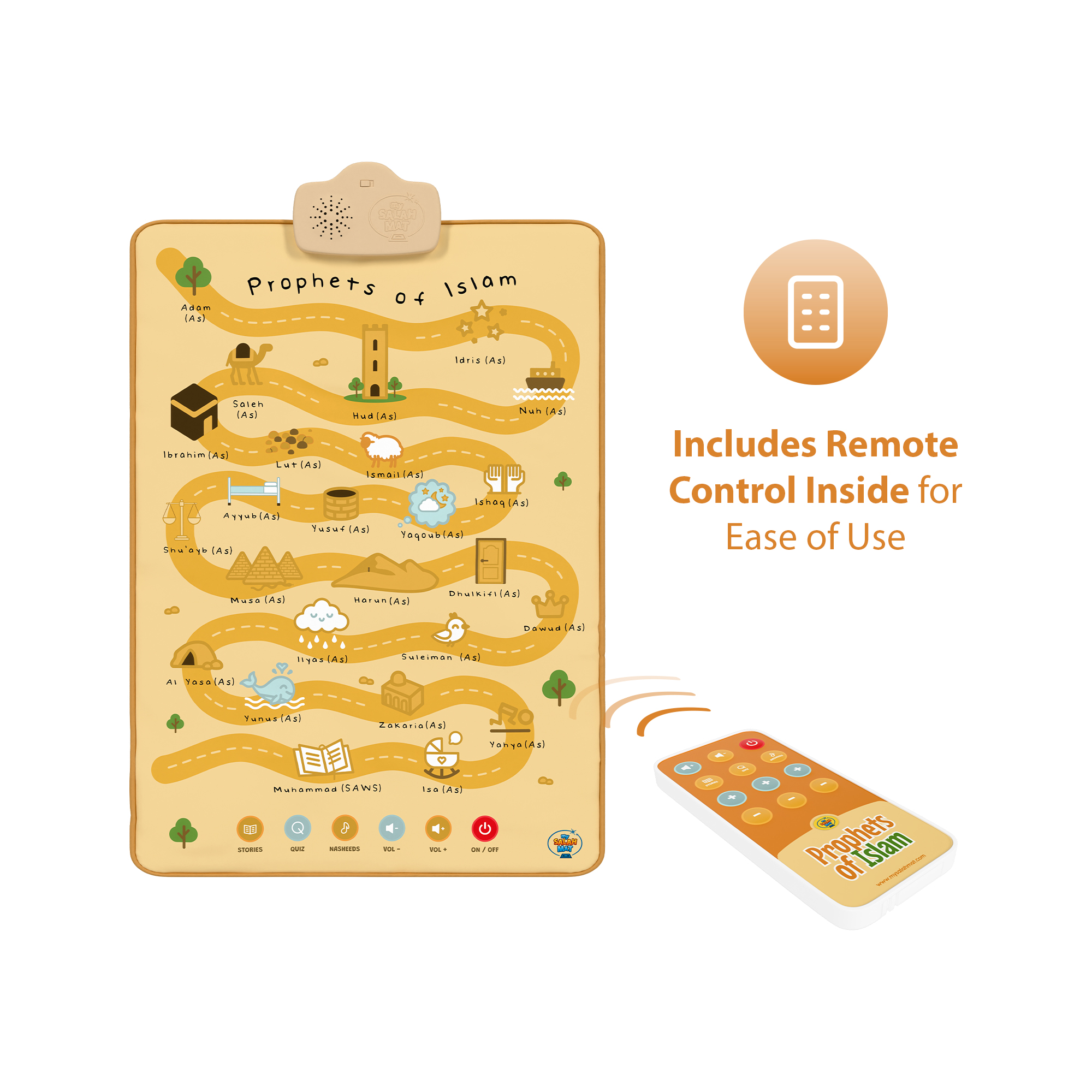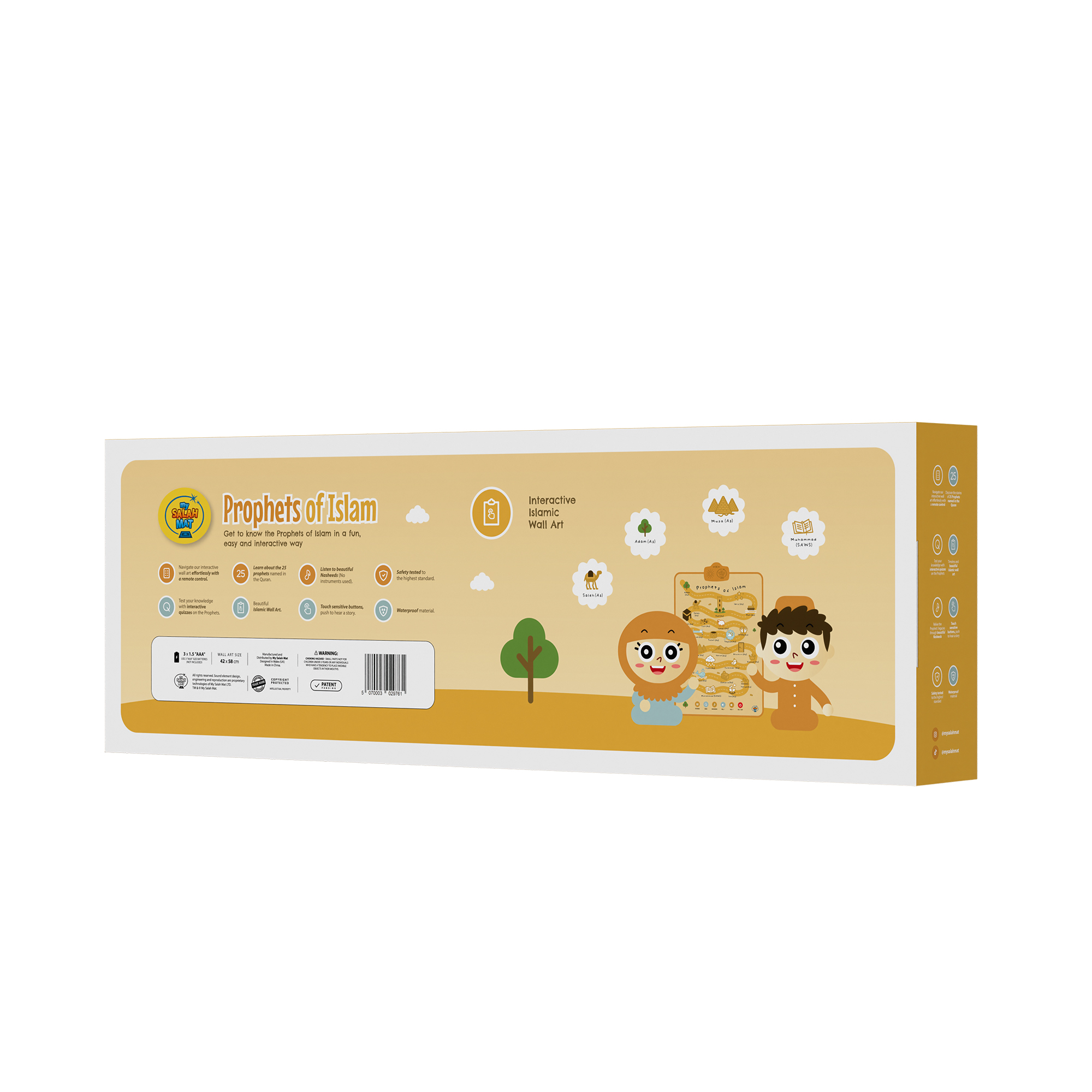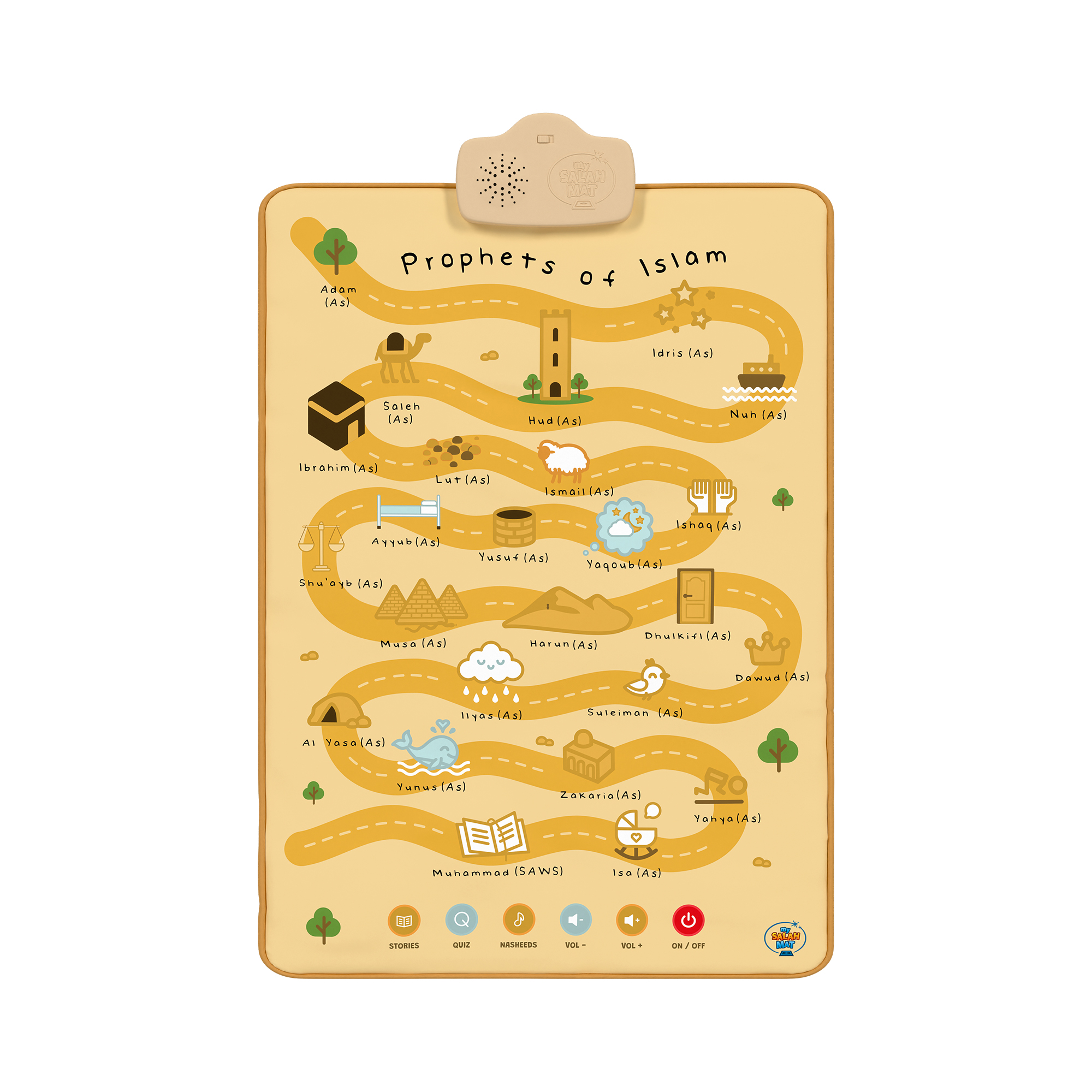 The Prophets of Islam Interactive Audio Mat & Wall Art combines learning and play through touch, sound, and storytelling. Each Prophet’s name unlocks a short audio story, making Islamic history easy to understand and engaging for children of all ages. With colourful illustrations and built-in sound, children can explore the lives of the Prophets while developing listening skills, curiosity, and love for their faith.