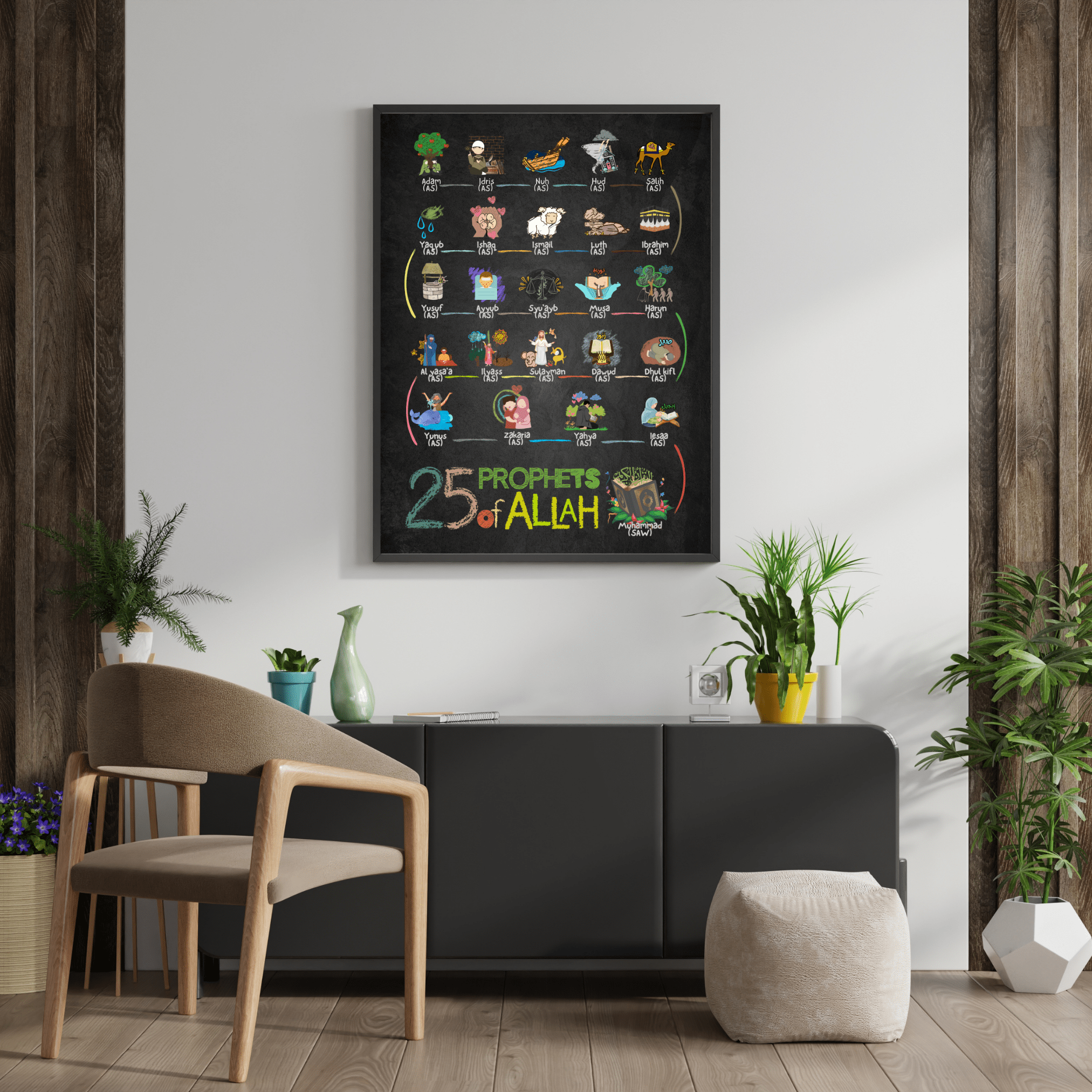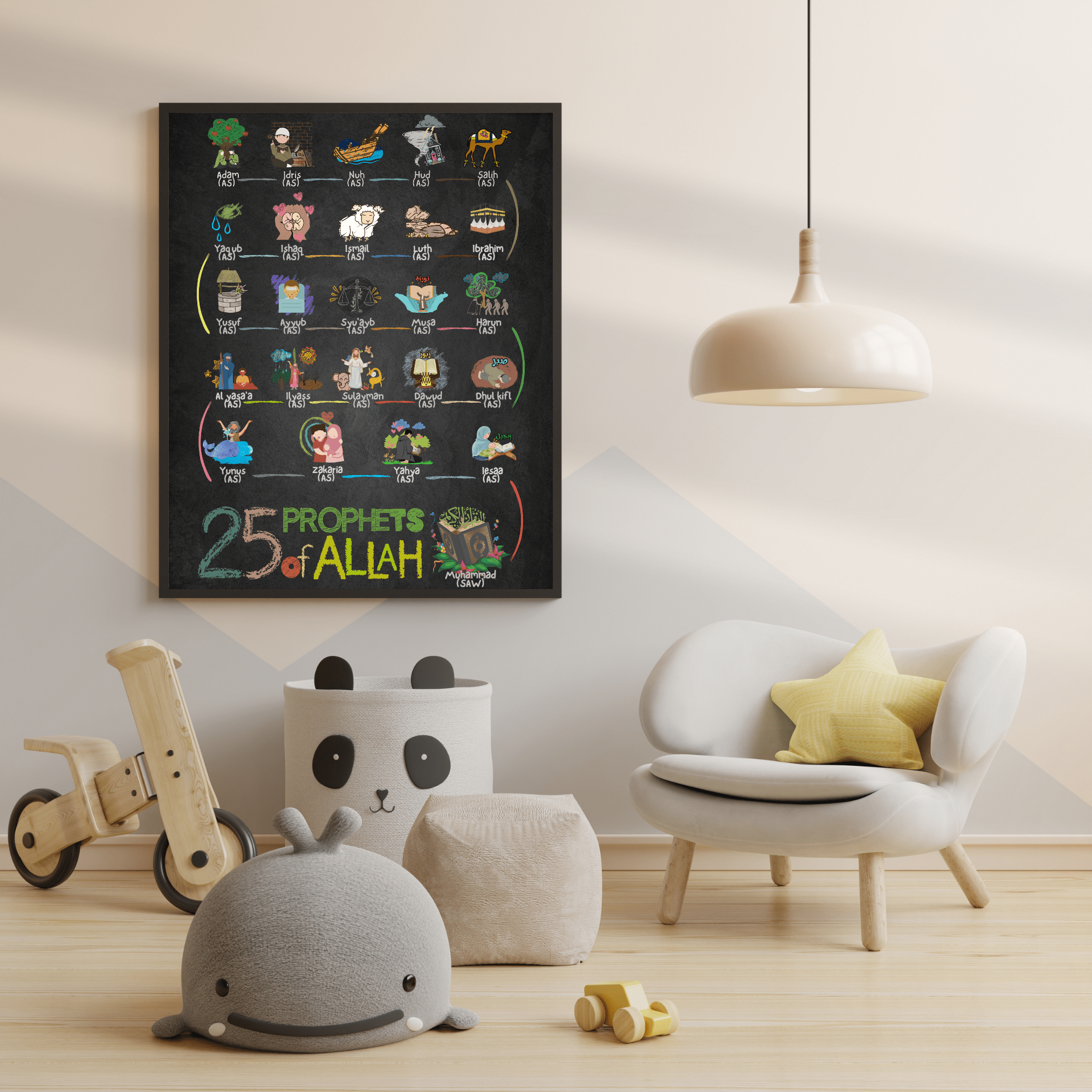 Here are 25 Islamic wall art prints featuring the names of the prophets, perfect for children's rooms or school walls: