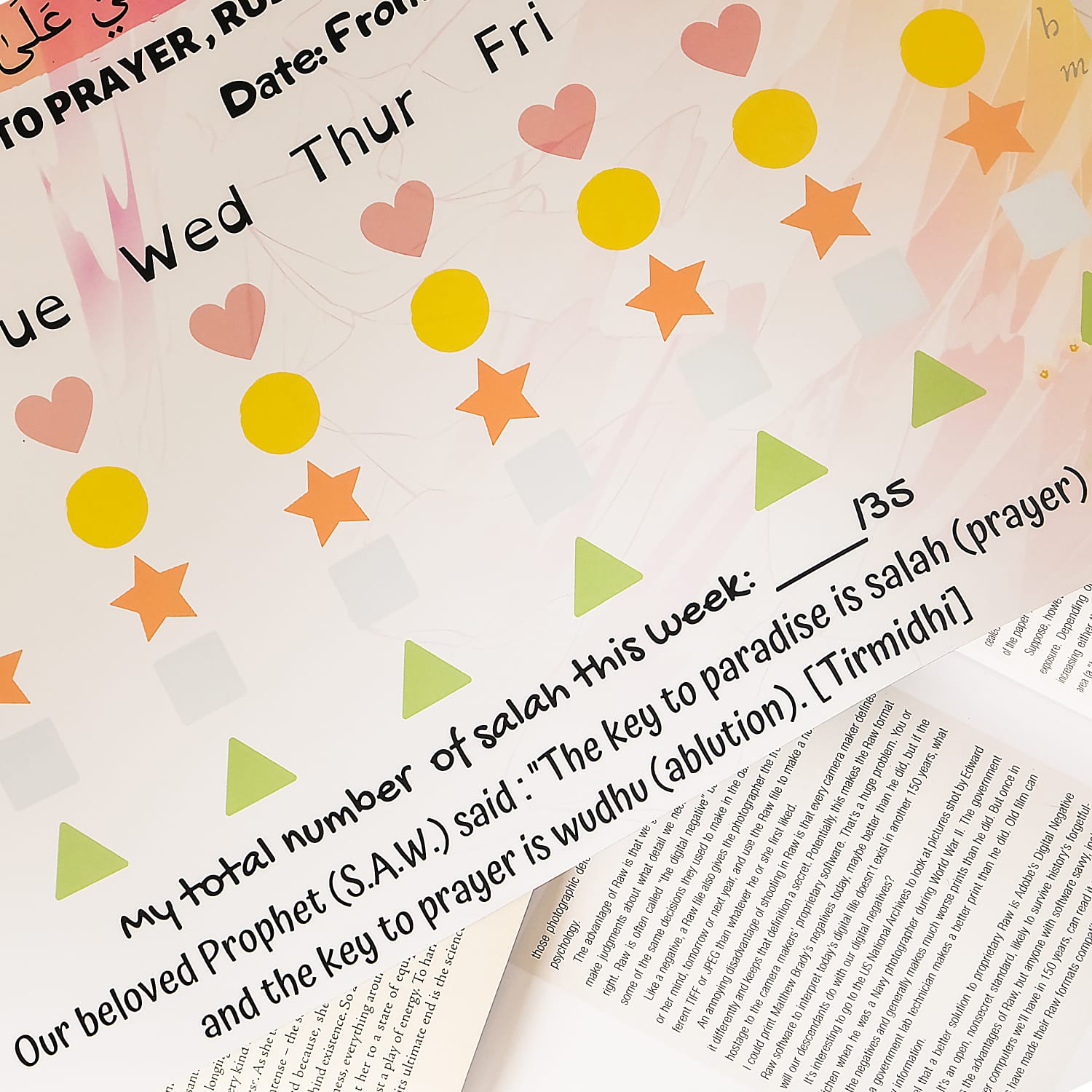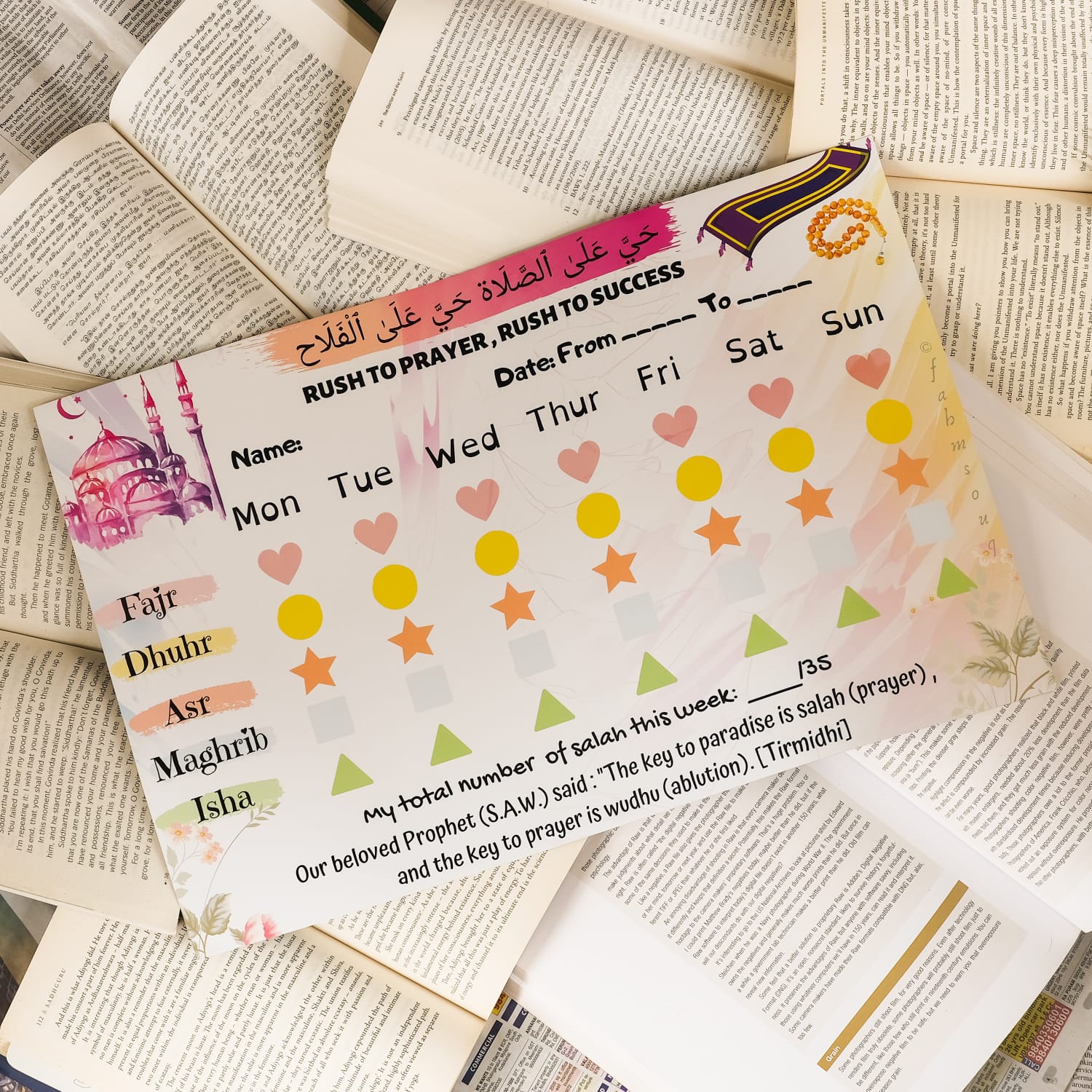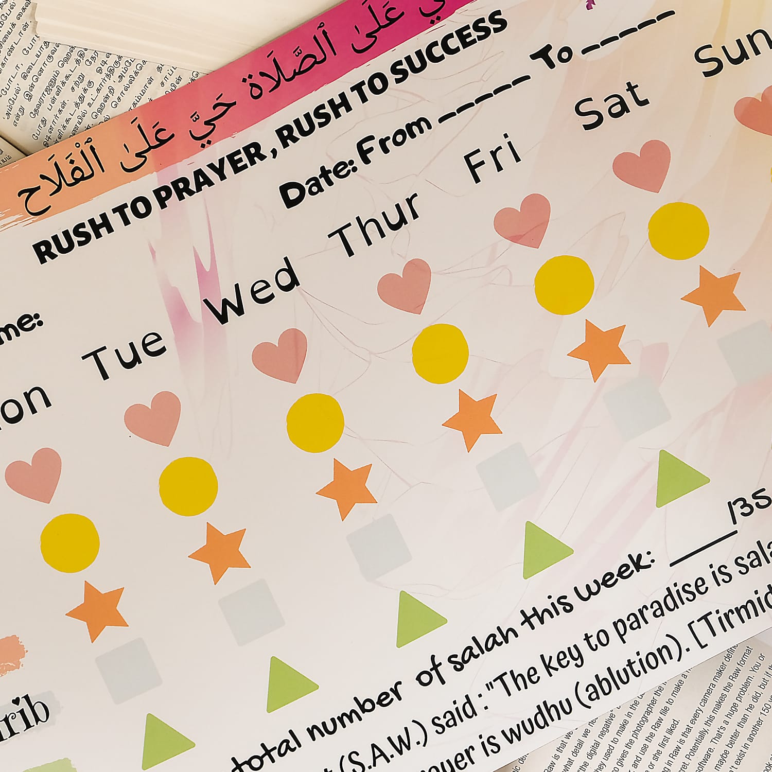 Habits are formed when it's regularly performed. The habit will be instilled easily in children when it's measured and encouraged. And that's what the Salah tracker offers you. It inculcates the habit of praying five times a day from young age. It's a perfect way to encourage your kids to pray every day by measuring their deeds and encouraging them. With this prayer tracker, you can ensure that your child will enjoy praying and doing them regularly in shaa Allah. The tracker is a *magnetic write and wipe* one, so you can use them for weeks after weeks in shaa Allah.