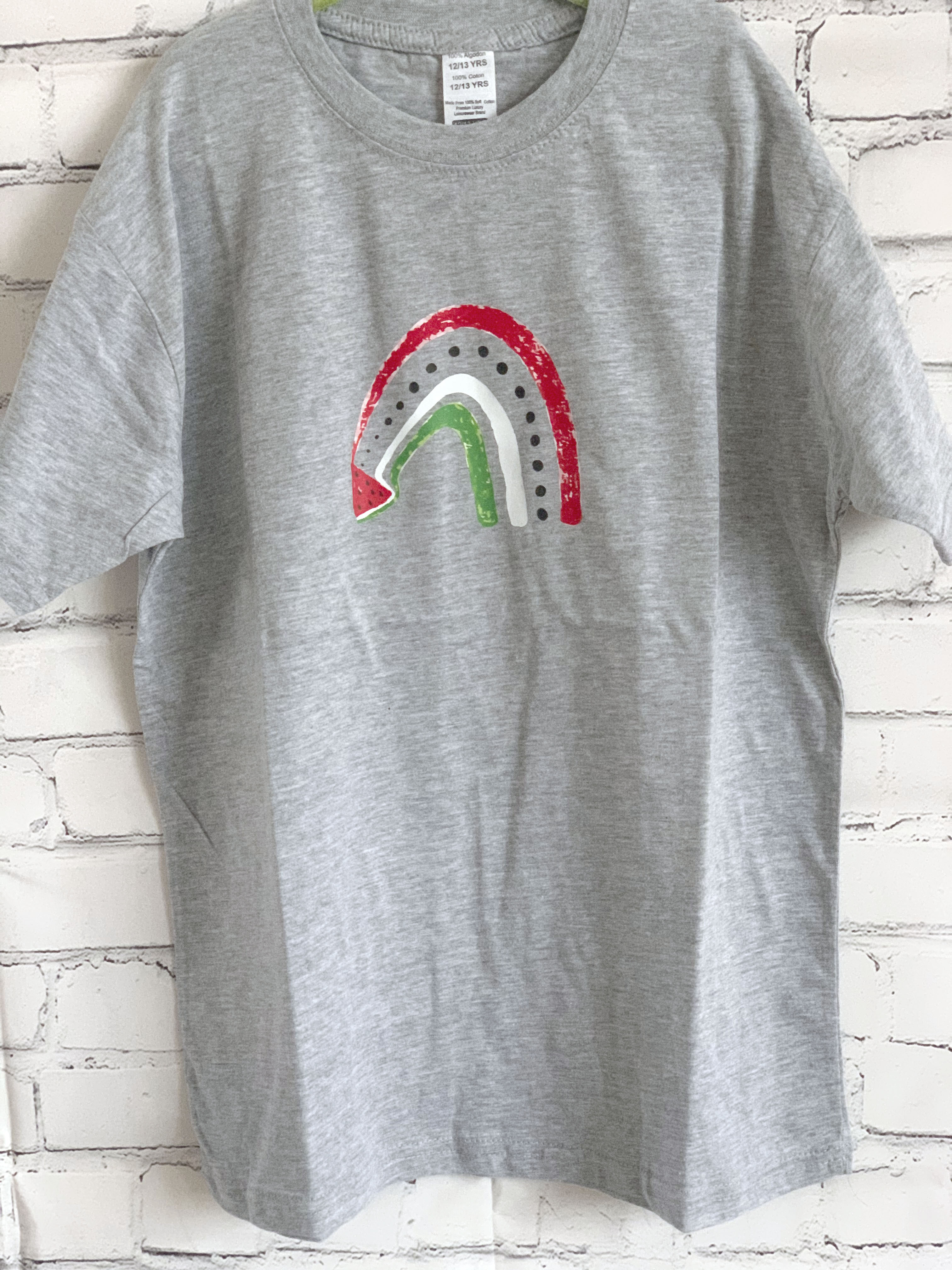 Embrace solidarity with this vibrant and meaningful t-shirt. Featuring a unique design of a rainbow emerging from a watermelon, adorned with the iconic colours of the Palestinian flag, it symbolises hope, resilience, and unity.