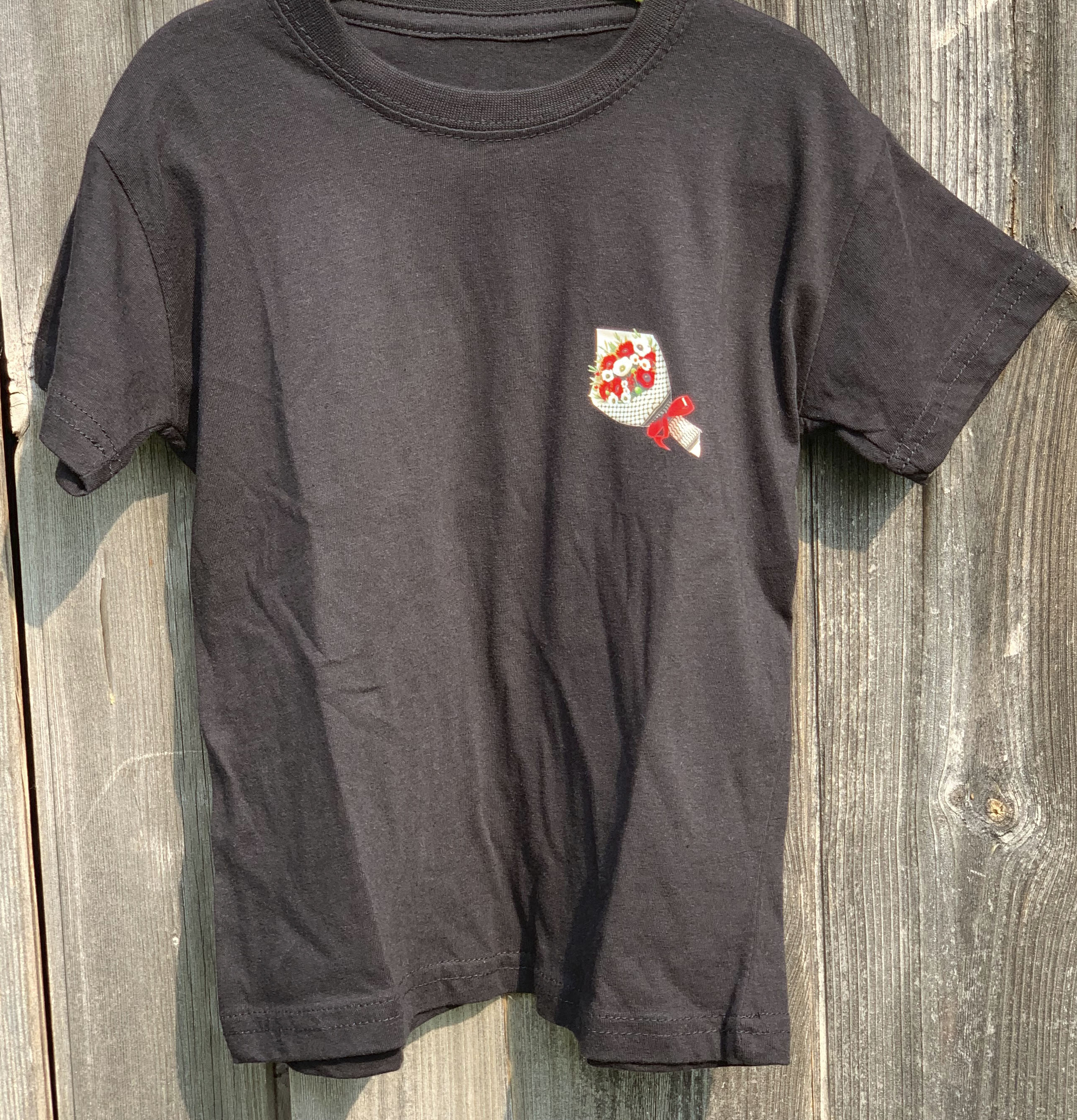 The focal point of this unique t-shirt is a small captivating image featuring a delicate arrangement of poppies and olives wrapped in paper, adorned with a keffiyeh-inspired design. The rich symbolism of poppies and olives, coupled with the keffiyeh pattern, creates a visual narrative advocating for peace in solidarity with the people of Palestine.