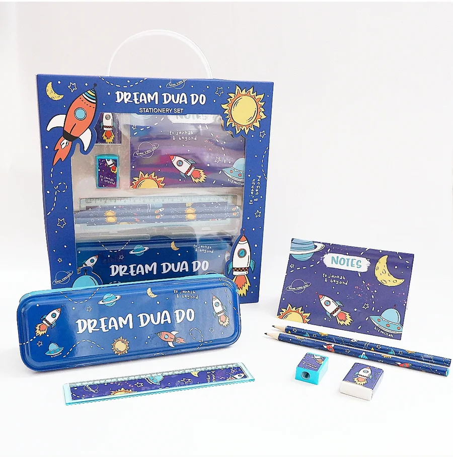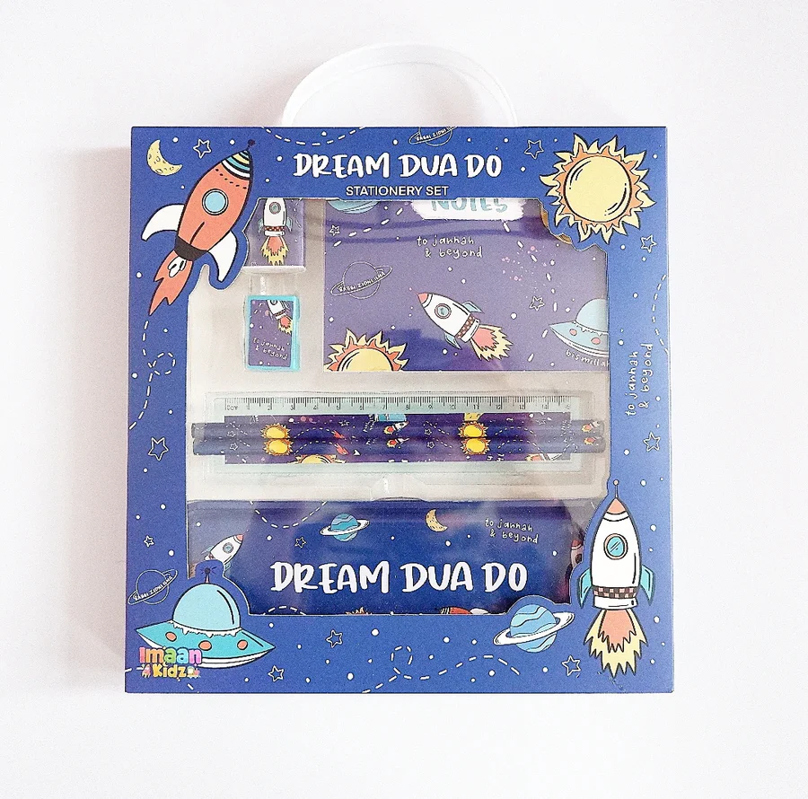 7 Piece Stationery set designed with Fun Islamic Reminders includes: