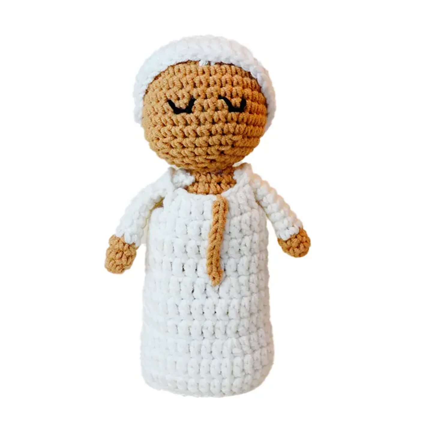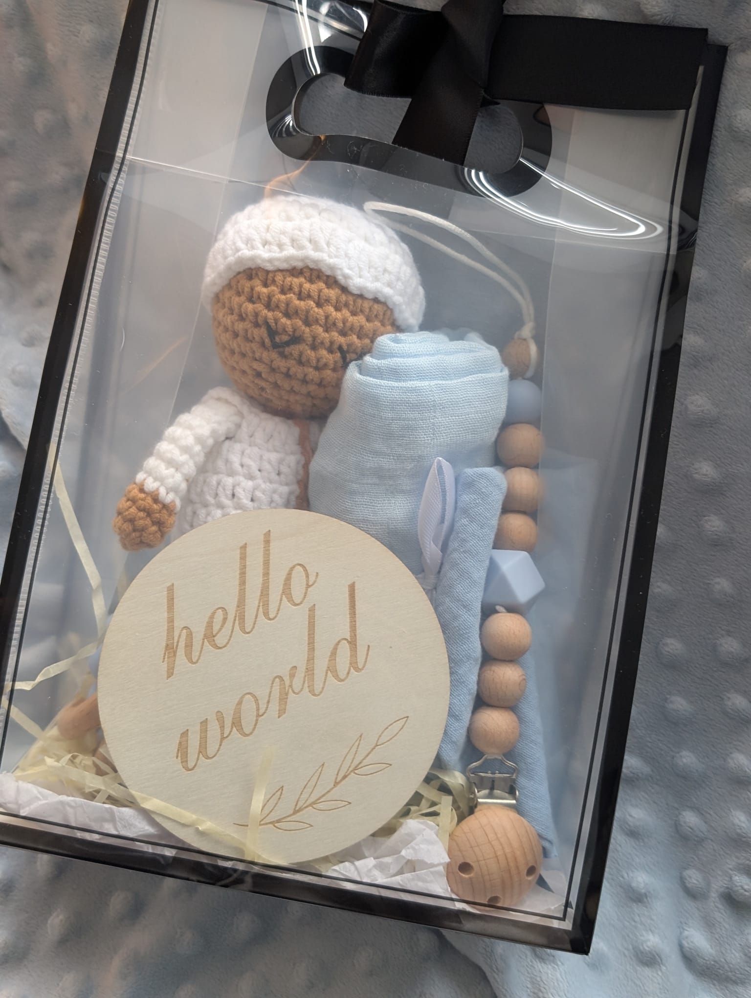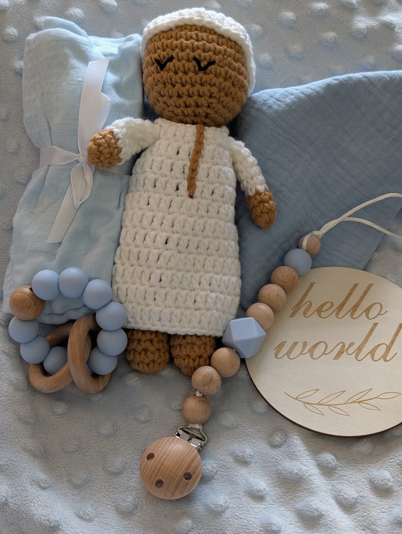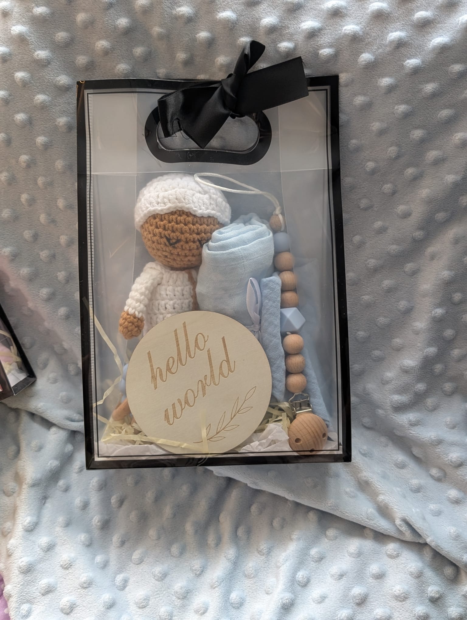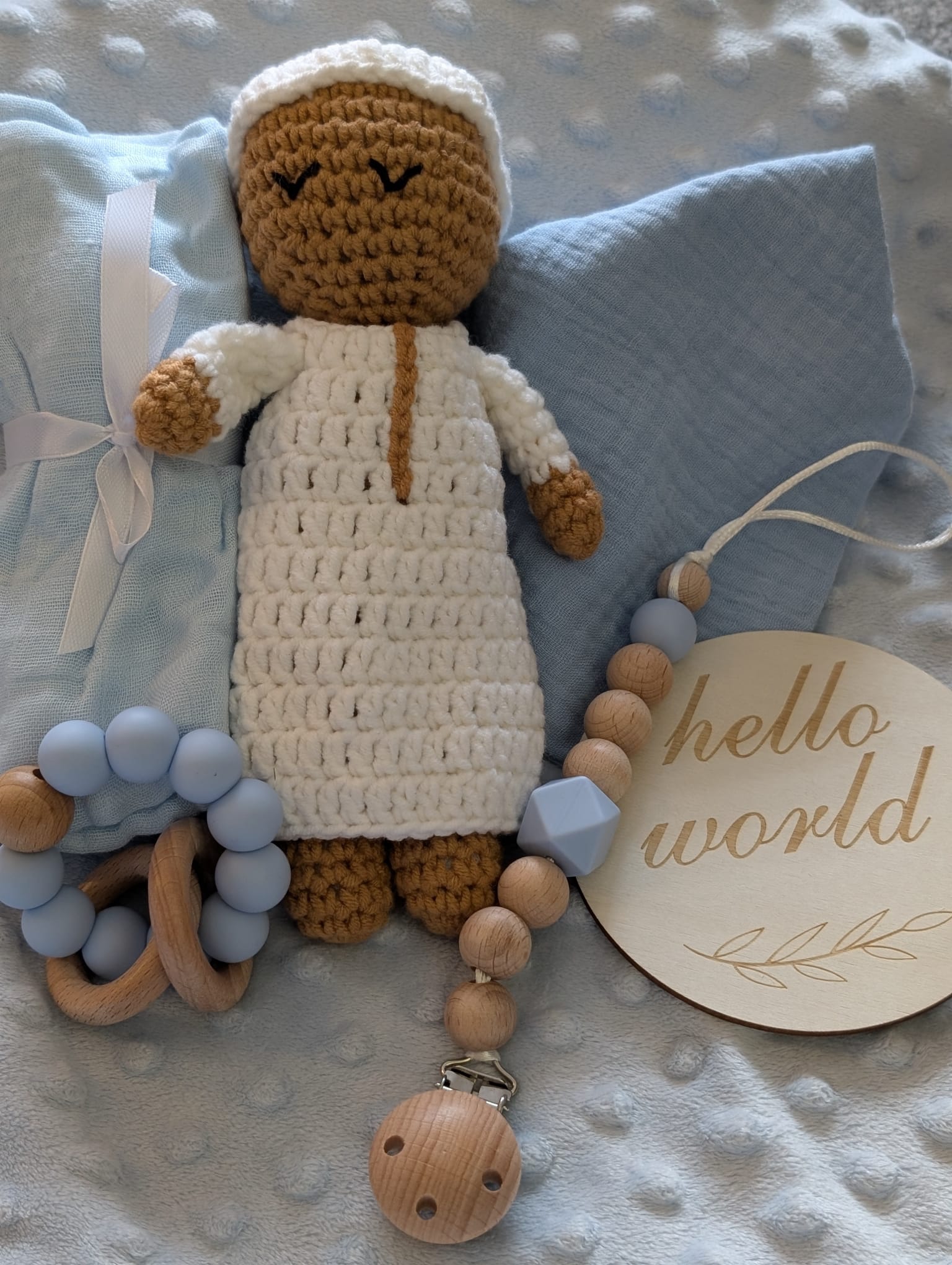 Looking for the perfect baby gift? Look no further! Our handmade crochet doll set includes everything a newborn needs - a doll, swaddle, teether, bib, and a "Hello World" wooden plate. Each piece is lovingly crafted with fine attention to detail and comes in an adorable gift bag. Don't miss out on this delightful bundle!