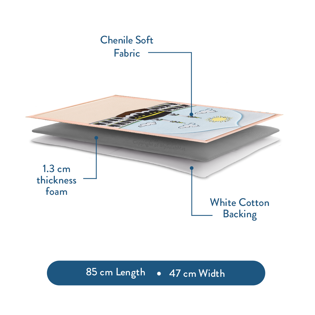 Urban Rugs UK brings a touch of inspiration to children’s salah with the Toddler Padded Prayer Mat in Midday in Mecca Design. Featuring a bright illustration of the Kaaba under the midday sun, surrounded by clouds and minarets, this joyful design connects children with the heart of Islamic worship in Makkah. The playful colours and fun pom-pom edging make it a favourite choice for baby Muslims.