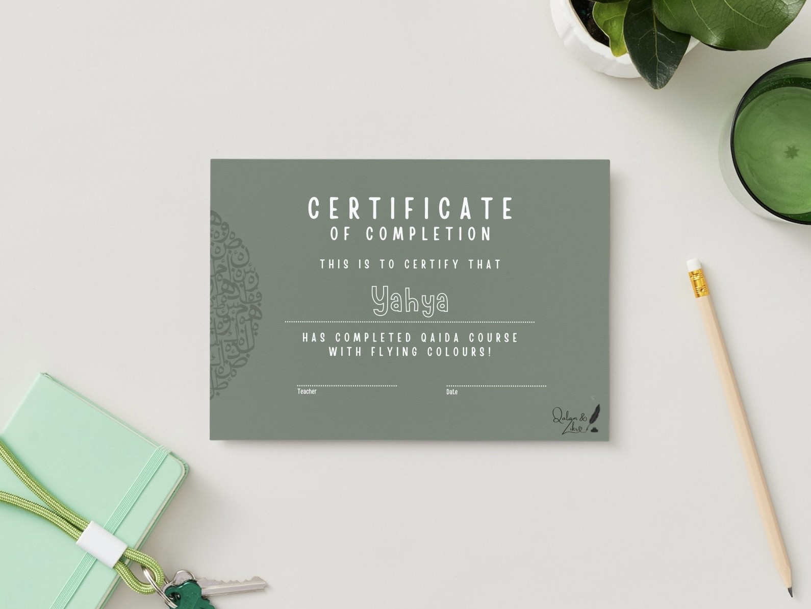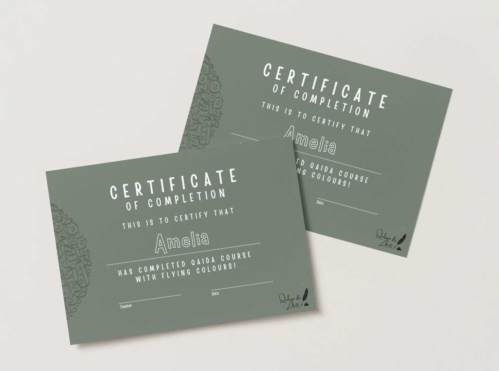 MaShaAllah! Your student has completed their Qaida course with flying colours and what better way to honour their achievement than this elegant Certificate of Completion?