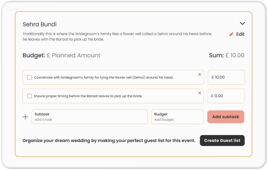 Each preset already includes editable detailed lists of pre-wedding, wedding, and post-wedding events, ensuring that every important cultural ritual and celebration is considered.
