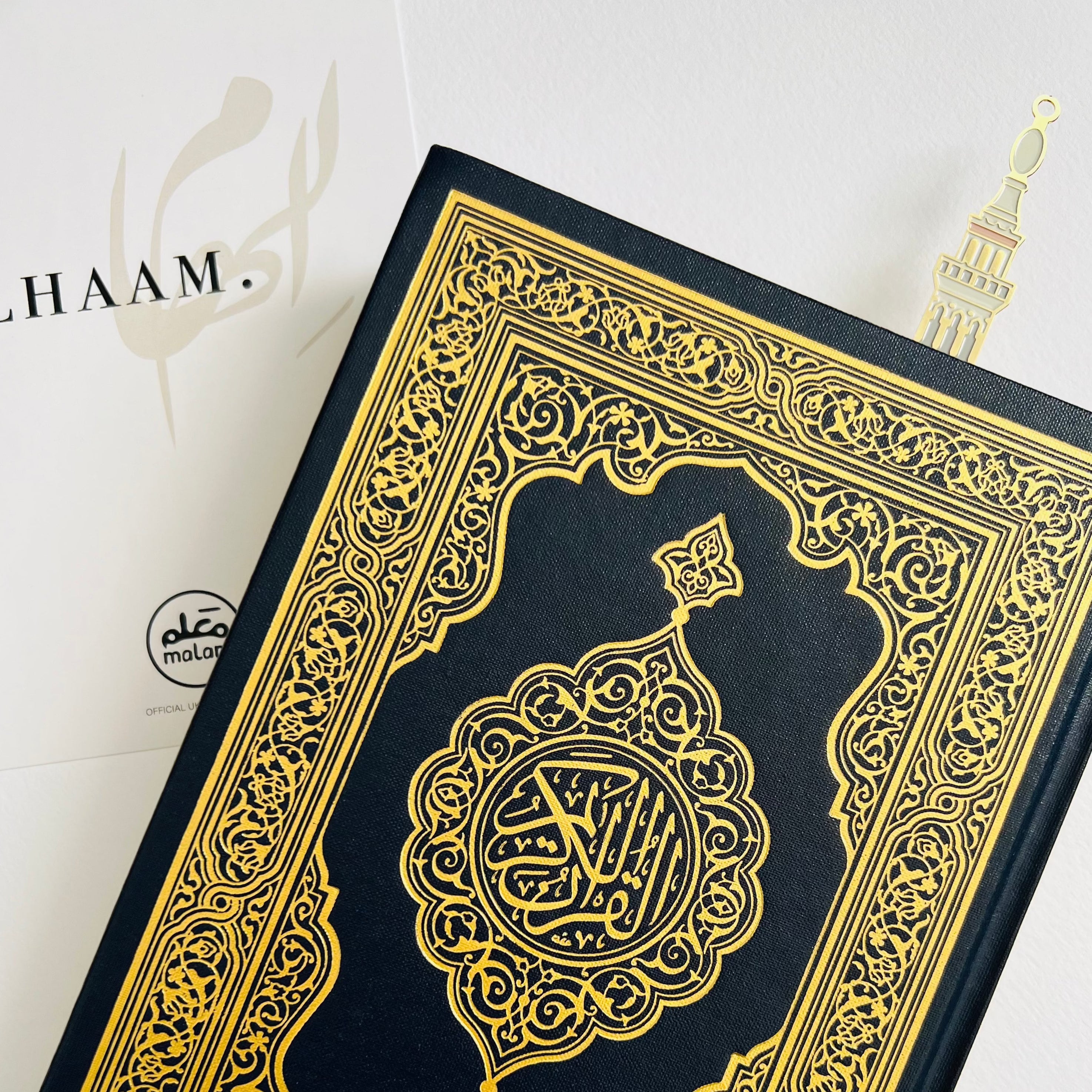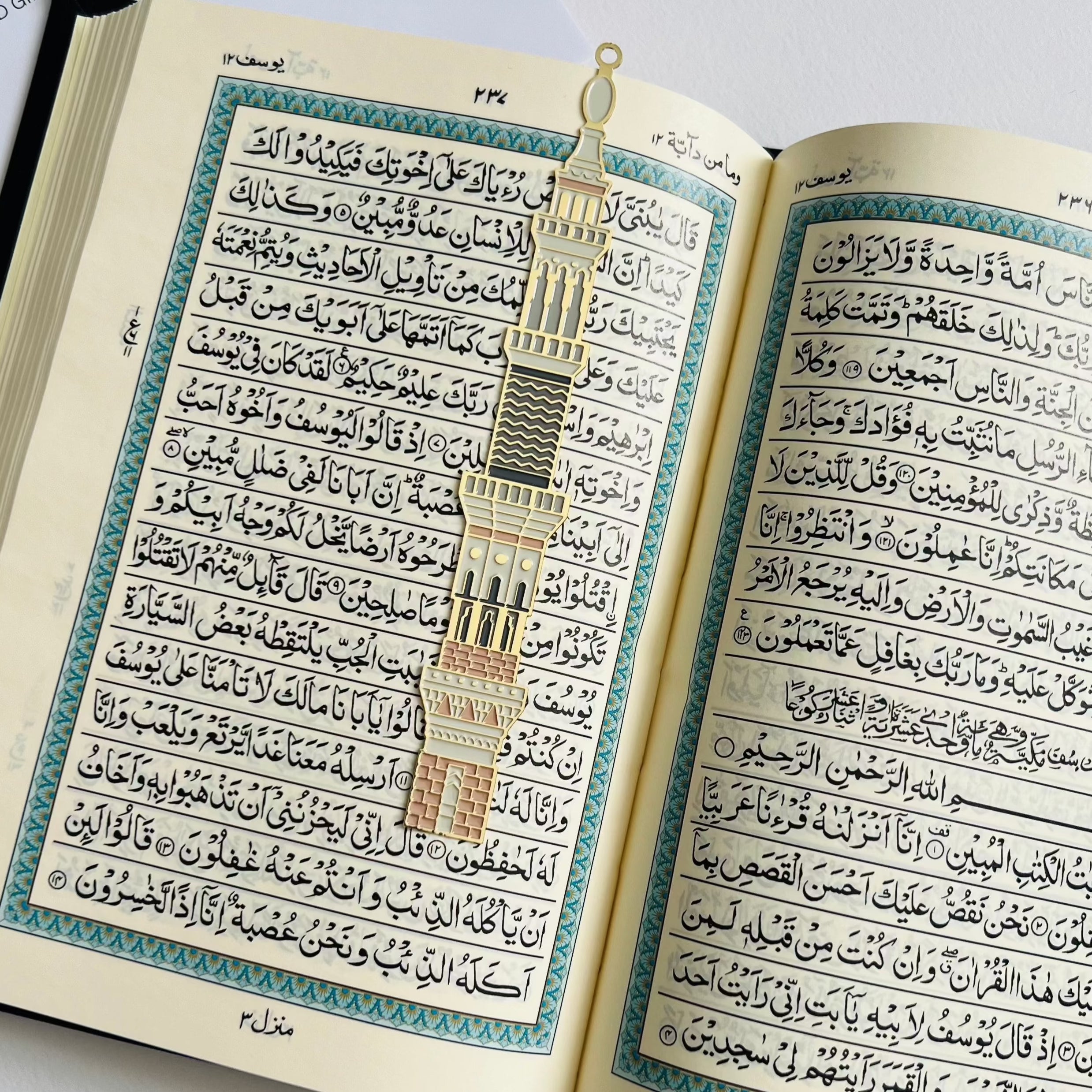 An exquisite addition to your collection, the Haram Minaret Bookmark features a golden metal separator adorned with intricate engravings inspired by the iconic Haram architecture. Measuring 2x15 cm, it is the perfect accompaniment for your cherished Qur'an and books.